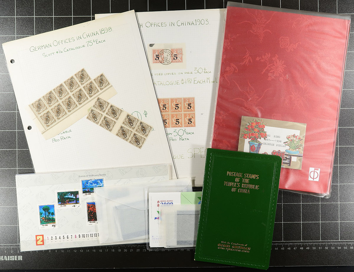 Hong Kong, China, even some Taiwan. A bit of a quirky lot, resulting from an estate. The majority of the volume is Hong Kong, with a number of mint presentation folders, and a handful of complete booklets both British and Chinese administration. The used includes a plastic case filled with #102 cards with used stamps going back to the 1960's. This collector may have been assembling QEII definitive sets for retail display, as there is a binder full of thin cards, each with one set (or partial set, as these were in progress) with anywhere from 1 to a couple dozen sets, plus some manila stockpages with "leftover" or future material (includes about 75 copies of $50.00 #651E, cat $10.00 each). There is a bit of PRC, including some display sets from the same collector. Early China and ROC are found in very small quantities, and there could be more that we missed. Estimate =