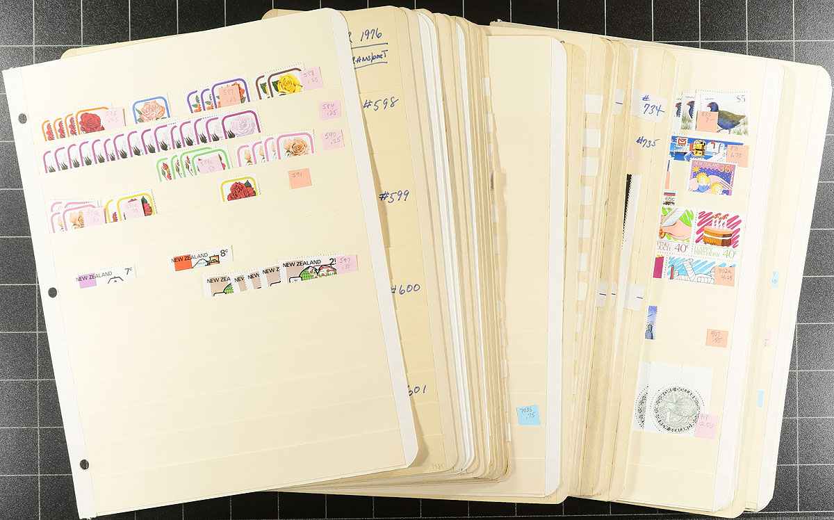 Large mint, decimal era mint accumulation covering two decades starting in the mid-1970's. Nicely organized on forty manila stockpages, with good coverage of commemoratives and definitives, plus a bit of Ross Dependency. Anywhere from 1 to 20 stamps of a type, including many blocks and lots of complete sets. Includes better singles, such as the "Birds" to $5.00 and a $10.00 Kiwi, a $5 "Beehive", Butterflies to $4.00. All appear to be never hinged, with a total face value of NZ$525.00 ($420.00 CDN). Estimate =