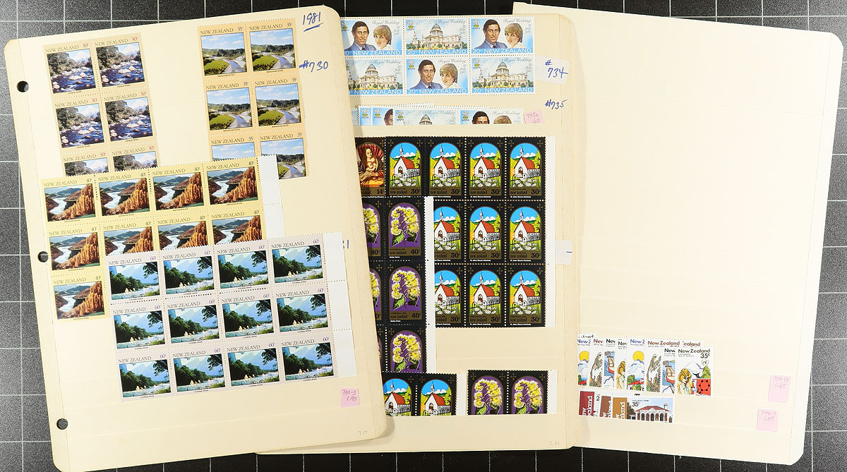 Large mint, decimal era mint accumulation covering two decades starting in the mid-1970's. Nicely organized on forty manila stockpages, with good coverage of commemoratives and definitives, plus a bit of Ross Dependency. Anywhere from 1 to 20 stamps of a type, including many blocks and lots of complete sets. Includes better singles, such as the "Birds" to $5.00 and a $10.00 Kiwi, a $5 "Beehive", Butterflies to $4.00. All appear to be never hinged, with a total face value of NZ$525.00 ($420.00 CDN). Estimate =