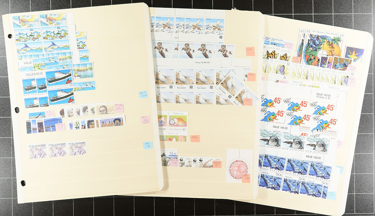 Large mint, decimal era mint accumulation covering two decades starting in the mid-1970's. Nicely organized on forty manila stockpages, with good coverage of commemoratives and definitives, plus a bit of Ross Dependency. Anywhere from 1 to 20 stamps of a type, including many blocks and lots of complete sets. Includes better singles, such as the "Birds" to $5.00 and a $10.00 Kiwi, a $5 "Beehive", Butterflies to $4.00. All appear to be never hinged, with a total face value of NZ$525.00 ($420.00 CDN). Estimate =