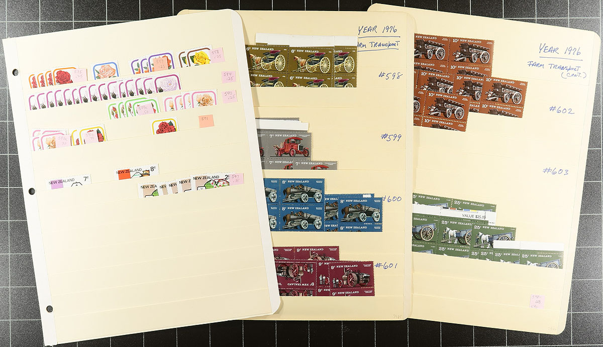 Large mint, decimal era mint accumulation covering two decades starting in the mid-1970's. Nicely organized on forty manila stockpages, with good coverage of commemoratives and definitives, plus a bit of Ross Dependency. Anywhere from 1 to 20 stamps of a type, including many blocks and lots of complete sets. Includes better singles, such as the "Birds" to $5.00 and a $10.00 Kiwi, a $5 "Beehive", Butterflies to $4.00. All appear to be never hinged, with a total face value of NZ$525.00 ($420.00 CDN). Estimate =