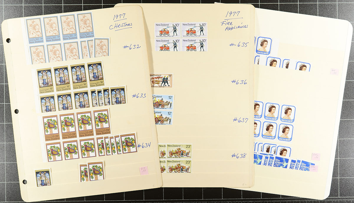 Large mint, decimal era mint accumulation covering two decades starting in the mid-1970's. Nicely organized on forty manila stockpages, with good coverage of commemoratives and definitives, plus a bit of Ross Dependency. Anywhere from 1 to 20 stamps of a type, including many blocks and lots of complete sets. Includes better singles, such as the "Birds" to $5.00 and a $10.00 Kiwi, a $5 "Beehive", Butterflies to $4.00. All appear to be never hinged, with a total face value of NZ$525.00 ($420.00 CDN). Estimate =