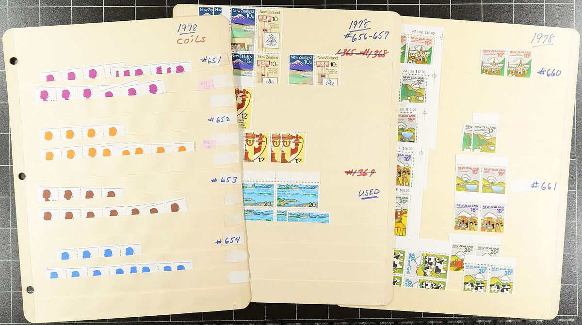 Large mint, decimal era mint accumulation covering two decades starting in the mid-1970's. Nicely organized on forty manila stockpages, with good coverage of commemoratives and definitives, plus a bit of Ross Dependency. Anywhere from 1 to 20 stamps of a type, including many blocks and lots of complete sets. Includes better singles, such as the "Birds" to $5.00 and a $10.00 Kiwi, a $5 "Beehive", Butterflies to $4.00. All appear to be never hinged, with a total face value of NZ$525.00 ($420.00 CDN). Estimate =