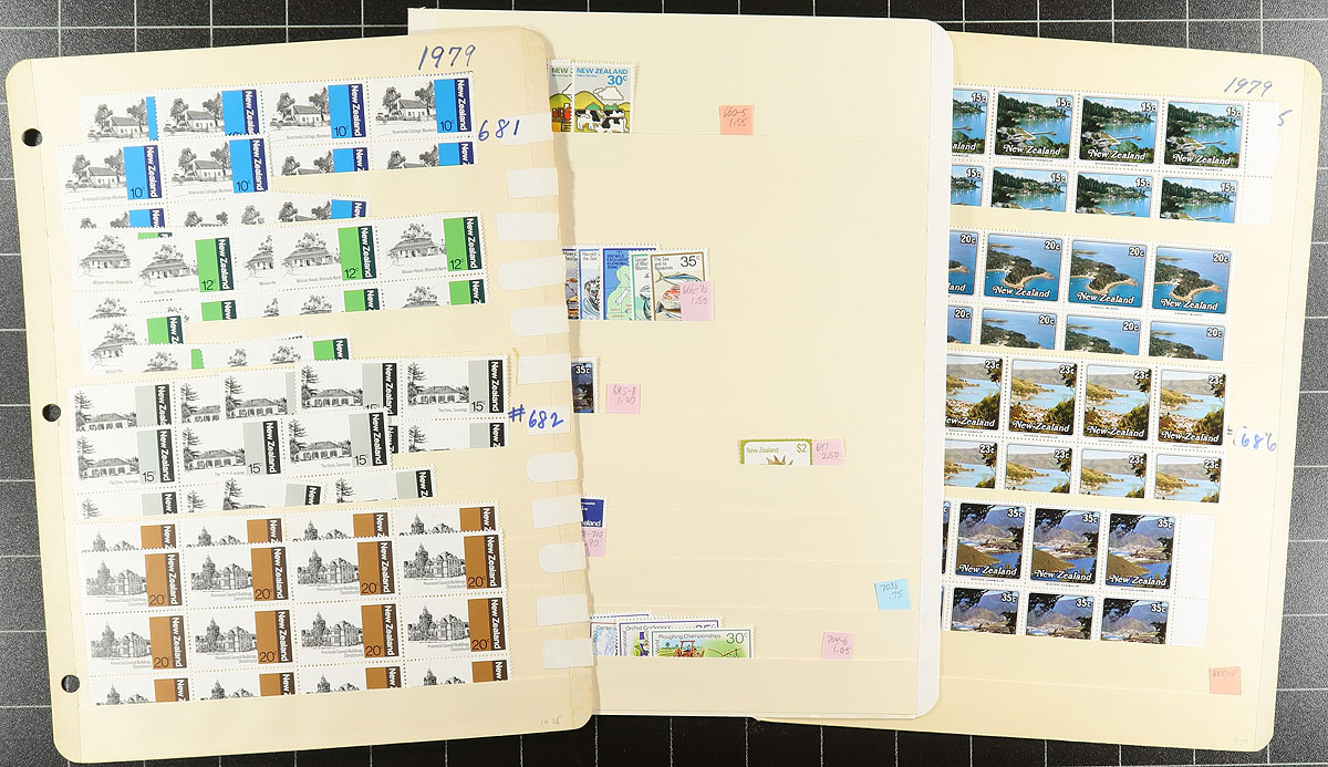 Large mint, decimal era mint accumulation covering two decades starting in the mid-1970's. Nicely organized on forty manila stockpages, with good coverage of commemoratives and definitives, plus a bit of Ross Dependency. Anywhere from 1 to 20 stamps of a type, including many blocks and lots of complete sets. Includes better singles, such as the "Birds" to $5.00 and a $10.00 Kiwi, a $5 "Beehive", Butterflies to $4.00. All appear to be never hinged, with a total face value of NZ$525.00 ($420.00 CDN). Estimate =