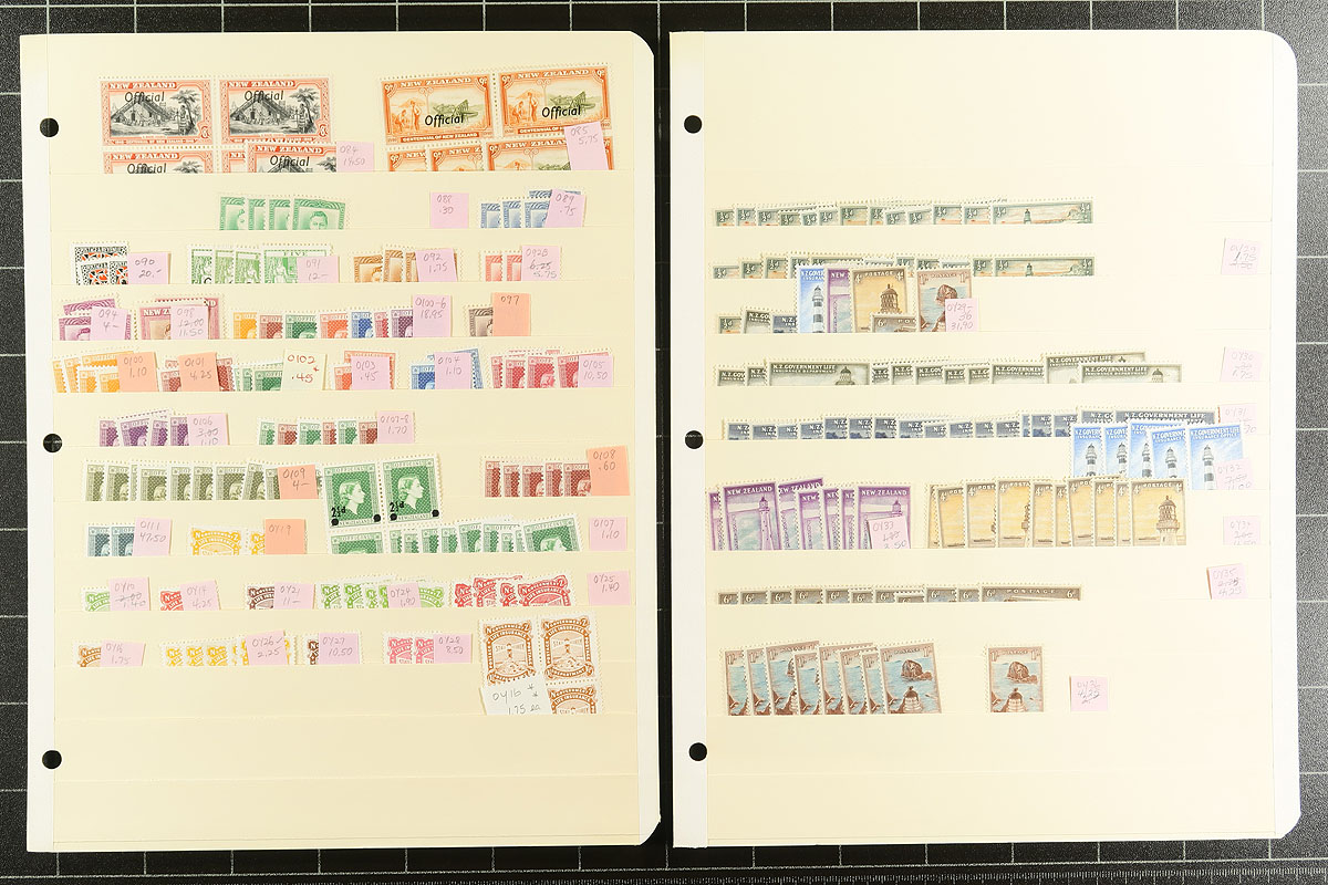 A "back of the book" mint holding #2: with "Official" overprints with lots from the King Edward VII, King George V, 1935 and 1940 sets (#O28, #O35-O36, #O53, #O69, #O71a), with some "Life Insurance" issues, a few "Newspaper" stamps (with #P3b), finishing with some earlier Ross Dependencies issues (including the first set in both imperial and decimal currency). The better tend to have 1 to 5 copies of each, the more common are up to 30 of a type. Nicely organized and identified on manila stockpages. A mix of hinged (the Queen Victoria era material tends to be very heavily hinged, as normal) and never hinged. Individual items with catalogue values to $70.00, and in total, there are a few thousand dollars of catalogue value here. No better way to build your collection! Estimate =