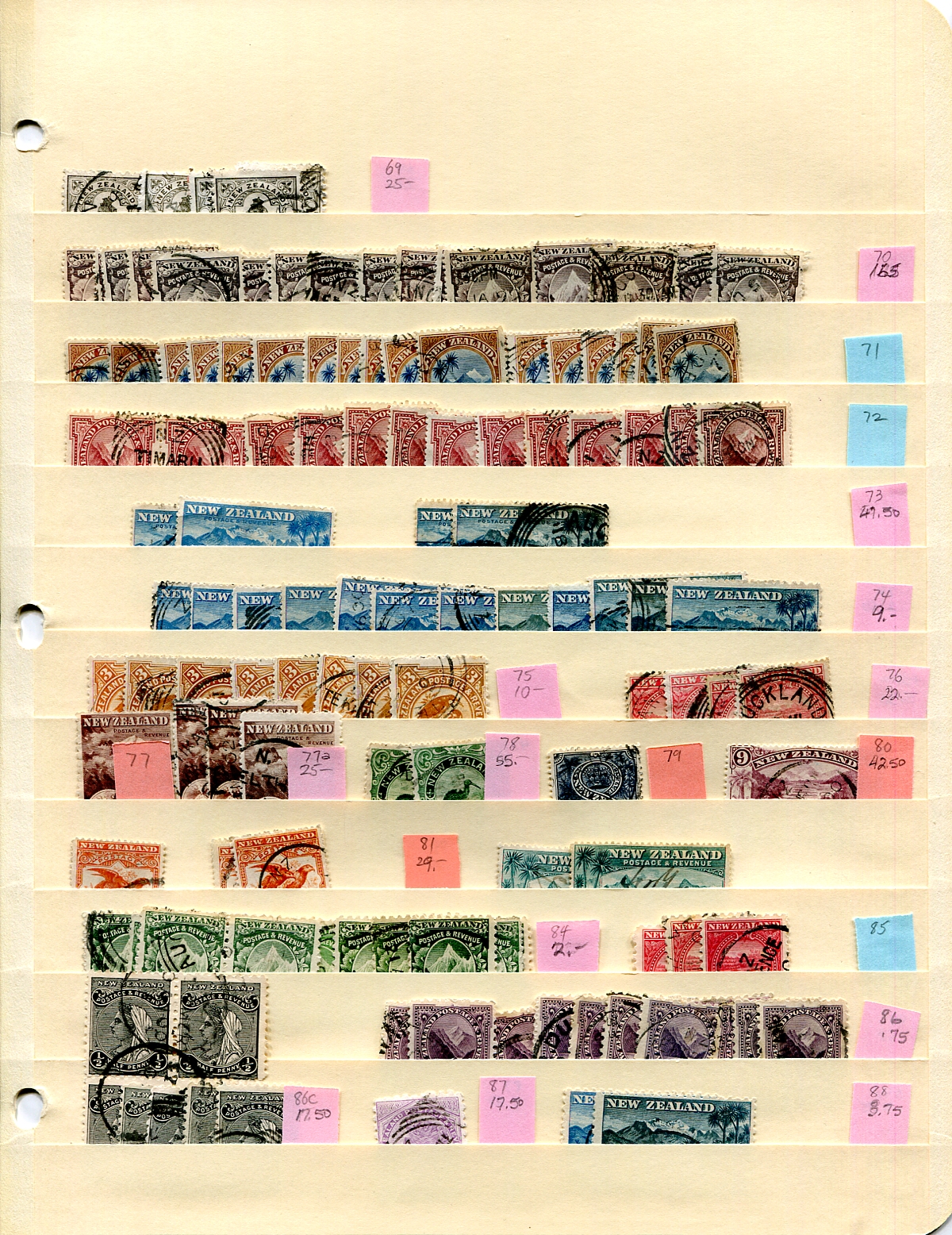 Used Queen Victoria-era accumulation on three manila stockpages, with a cursory sort by Scott, but awaiting a specialist’s eye. Includes a good selection of the "Side Face" issues, with some identified by Scott for shades and perforations, such as two copies of #68a (we haven’t verified). The 1898 "Pictorial" issue is well represented with values to the 1/- Kea (the 2/- Milford Sound are revenue cancelled and not considered). There is some cancel potential here, and there are stamps popping out everywhere with $10-$50 catalogue values. Opportunities like this do not come around very often. Estimate =