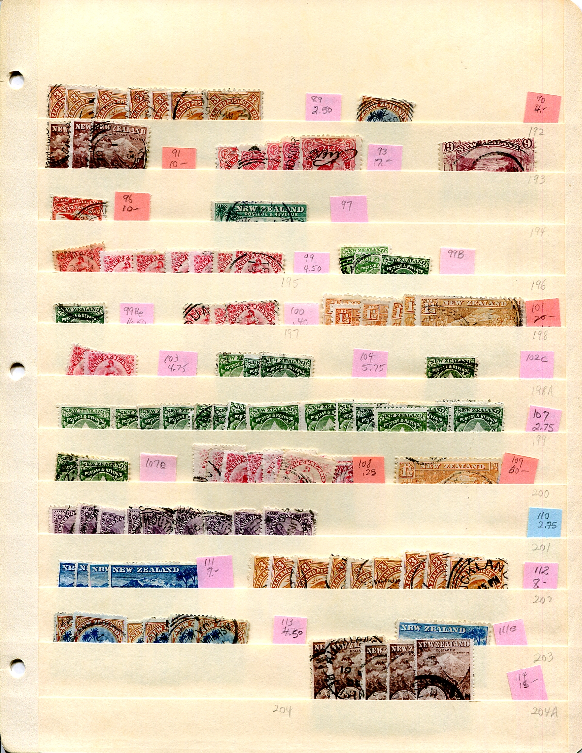 Used Queen Victoria-era accumulation on three manila stockpages, with a cursory sort by Scott, but awaiting a specialist’s eye. Includes a good selection of the "Side Face" issues, with some identified by Scott for shades and perforations, such as two copies of #68a (we haven’t verified). The 1898 "Pictorial" issue is well represented with values to the 1/- Kea (the 2/- Milford Sound are revenue cancelled and not considered). There is some cancel potential here, and there are stamps popping out everywhere with $10-$50 catalogue values. Opportunities like this do not come around very often. Estimate =