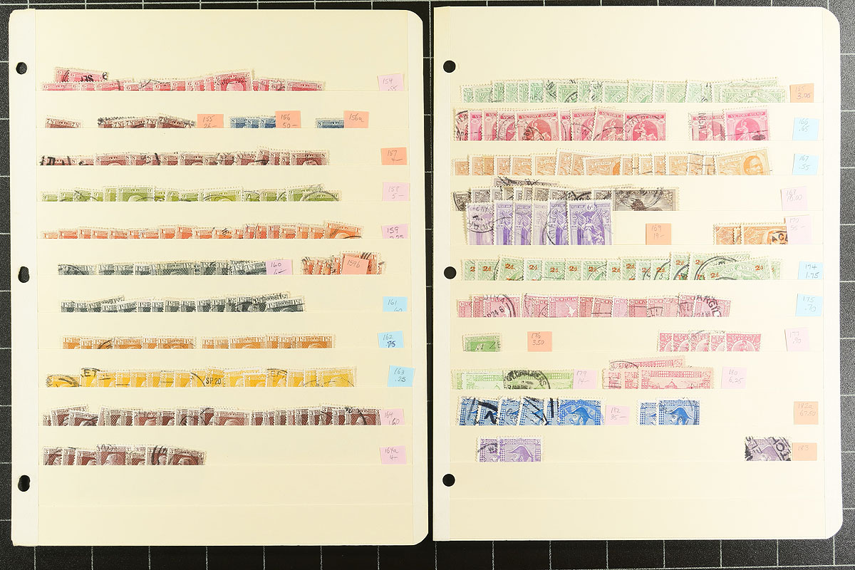Used accumulation from the late Victorian period to the King George VI Coronation issue on nine manila stockpages, with a cursory sort by Scott, but awaiting a specialist’s eye. The 1/2d Christchurch Exhibition has a matching cancel, and there are complete runs of King Edward VII and King George V definitives (to 1/-). The Victory issue is here, as are 2 of 3 values from the Dunedin Exhibition, plus a selection of 2/- and 3/- "Admirals", finishing strong with good representation of both printings of the 1935 set. There is cancel potential, and there are stamps popping out everywhere with $10-$20 catalogue values (and some even more). Opportunities like this do not come around very often. Estimate =