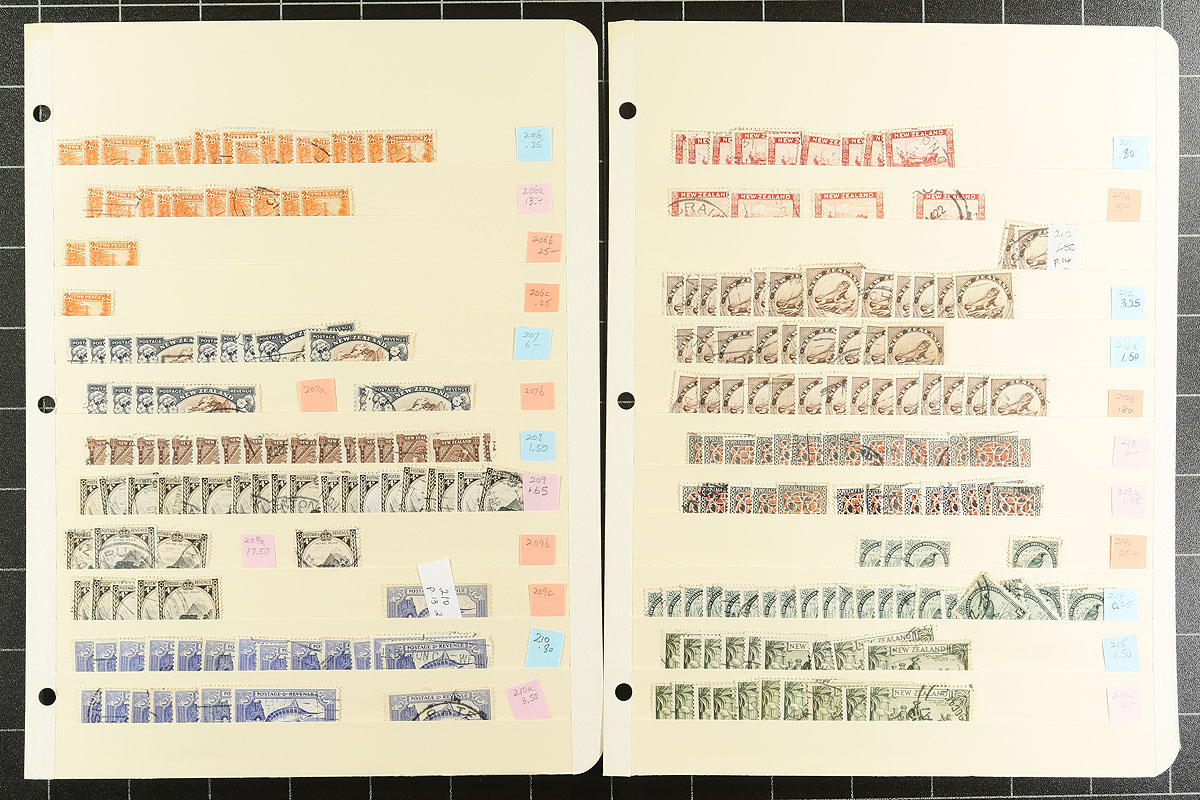Used accumulation from the late Victorian period to the King George VI Coronation issue on nine manila stockpages, with a cursory sort by Scott, but awaiting a specialist’s eye. The 1/2d Christchurch Exhibition has a matching cancel, and there are complete runs of King Edward VII and King George V definitives (to 1/-). The Victory issue is here, as are 2 of 3 values from the Dunedin Exhibition, plus a selection of 2/- and 3/- "Admirals", finishing strong with good representation of both printings of the 1935 set. There is cancel potential, and there are stamps popping out everywhere with $10-$20 catalogue values (and some even more). Opportunities like this do not come around very often. Estimate =