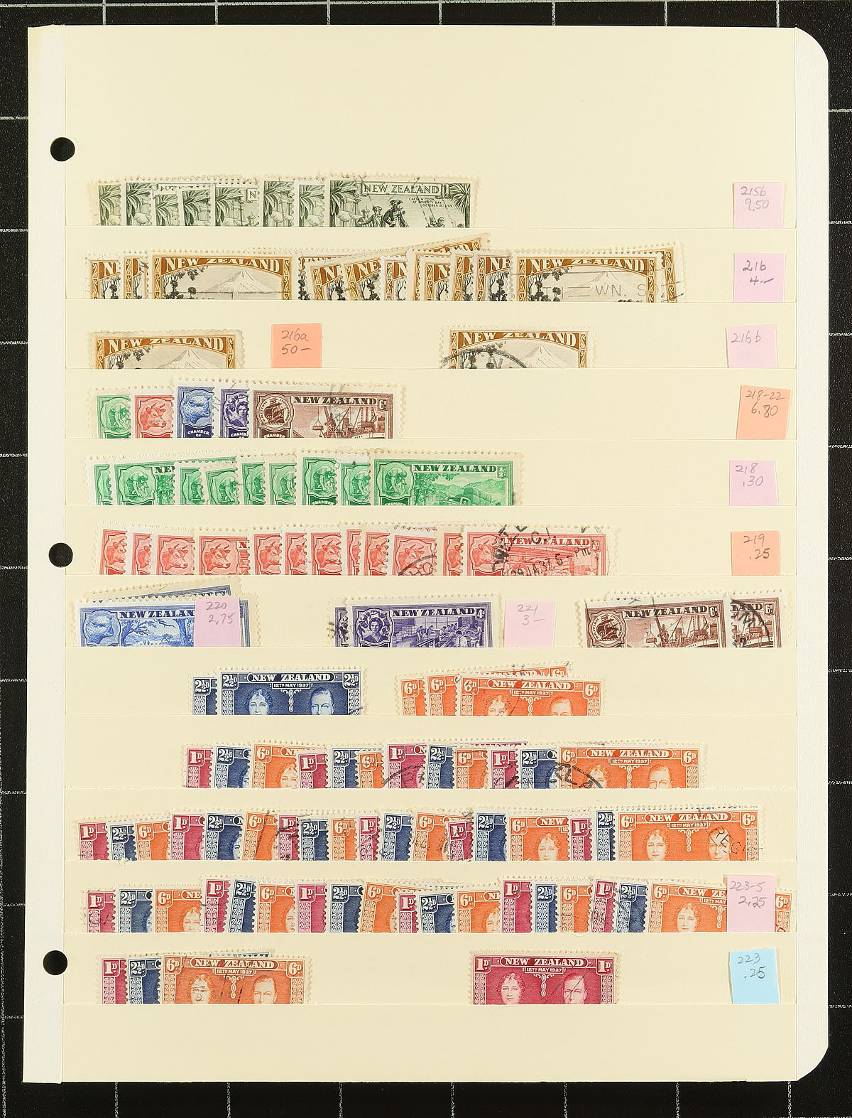Used accumulation from the late Victorian period to the King George VI Coronation issue on nine manila stockpages, with a cursory sort by Scott, but awaiting a specialist’s eye. The 1/2d Christchurch Exhibition has a matching cancel, and there are complete runs of King Edward VII and King George V definitives (to 1/-). The Victory issue is here, as are 2 of 3 values from the Dunedin Exhibition, plus a selection of 2/- and 3/- "Admirals", finishing strong with good representation of both printings of the 1935 set. There is cancel potential, and there are stamps popping out everywhere with $10-$20 catalogue values (and some even more). Opportunities like this do not come around very often. Estimate =