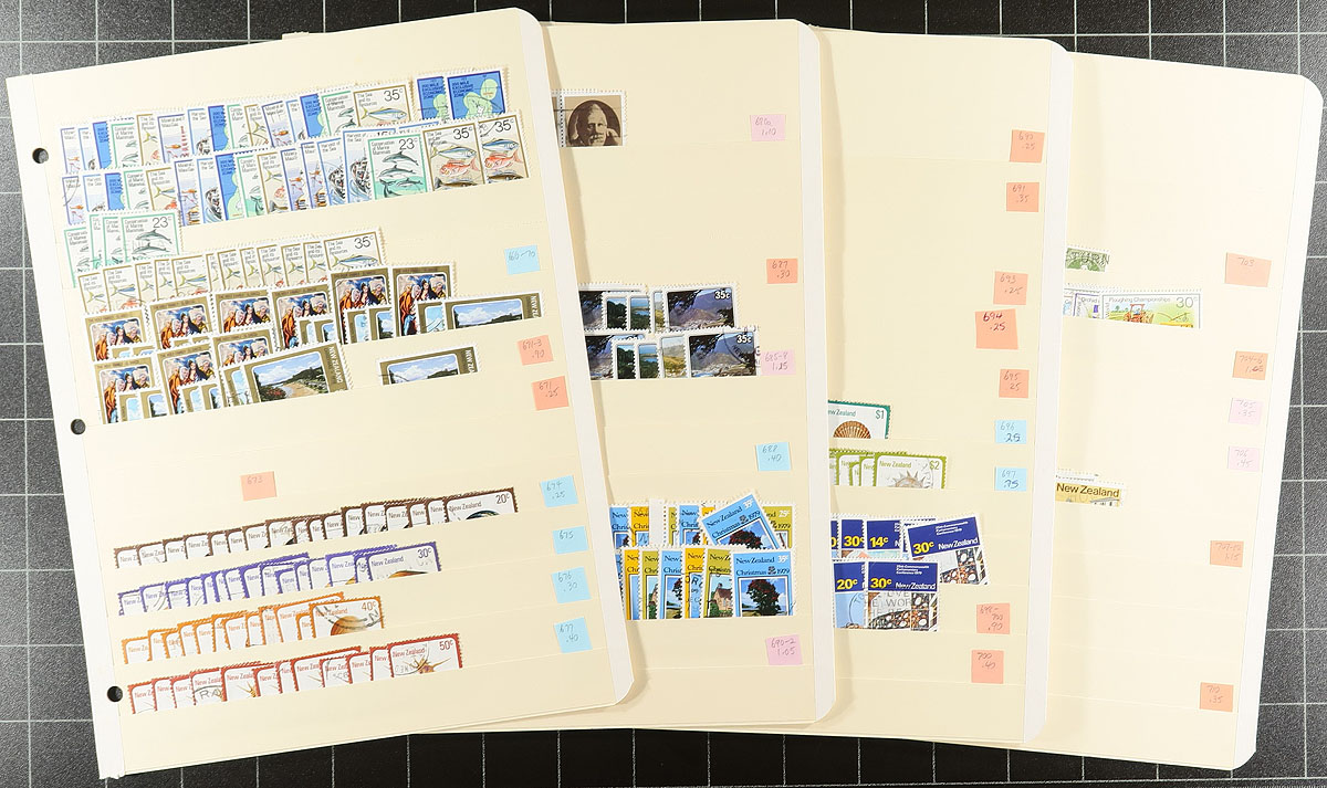 Group of 60 manila stockpage with used collector’s stock of regular issue stamps from the early King George VI issues to the mid-1980's. Steady coverage throughout, often with up to 20 of a type, including a healthy quantity of the 1940 Centennial series, #301 (10/- horse "Anzac" x8), £1 and $2.00 "Geysers", postal fiscal design $4-$10 including different watermarks (#404A/#404Da), with lots of catalogue values in the $4-$10 range (and a few better than that). Well over 5000 stamps here. One collector’s duplicates. Estimate =