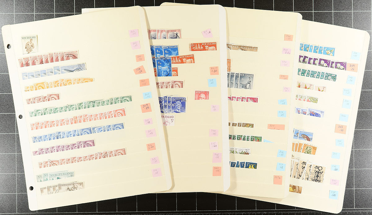Group of 60 manila stockpage with used collector’s stock of regular issue stamps from the early King George VI issues to the mid-1980's. Steady coverage throughout, often with up to 20 of a type, including a healthy quantity of the 1940 Centennial series, #301 (10/- horse "Anzac" x8), £1 and $2.00 "Geysers", postal fiscal design $4-$10 including different watermarks (#404A/#404Da), with lots of catalogue values in the $4-$10 range (and a few better than that). Well over 5000 stamps here. One collector’s duplicates. Estimate =