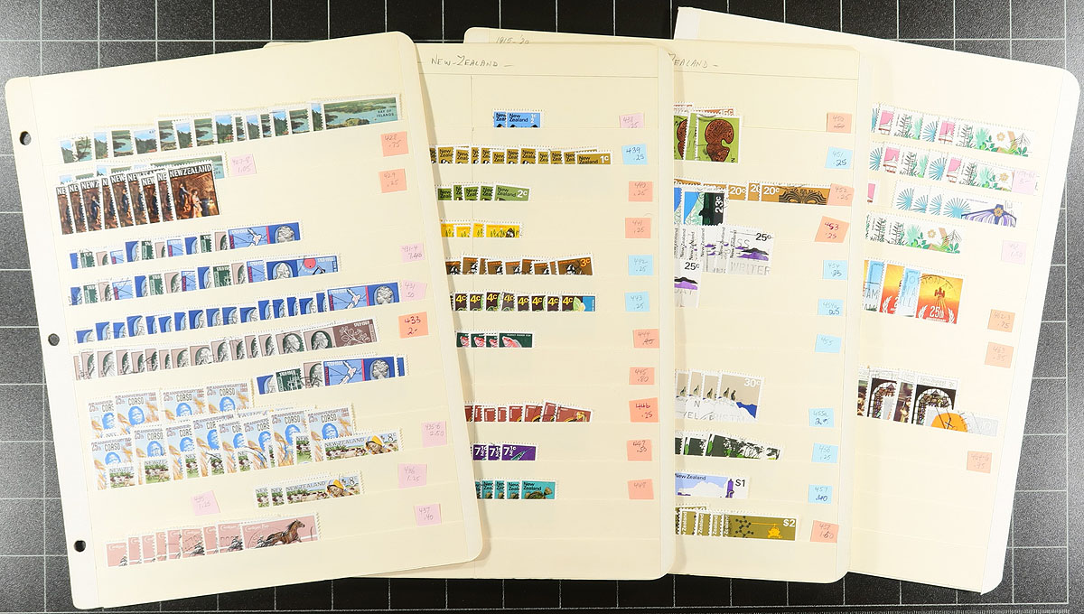 Group of 60 manila stockpage with used collector’s stock of regular issue stamps from the early King George VI issues to the mid-1980's. Steady coverage throughout, often with up to 20 of a type, including a healthy quantity of the 1940 Centennial series, #301 (10/- horse "Anzac" x8), £1 and $2.00 "Geysers", postal fiscal design $4-$10 including different watermarks (#404A/#404Da), with lots of catalogue values in the $4-$10 range (and a few better than that). Well over 5000 stamps here. One collector’s duplicates. Estimate =