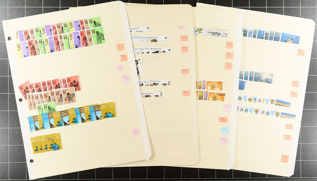Group of 60 manila stockpage with used collector’s stock of regular issue stamps from the early King George VI issues to the mid-1980's. Steady coverage throughout, often with up to 20 of a type, including a healthy quantity of the 1940 Centennial series, #301 (10/- horse "Anzac" x8), £1 and $2.00 "Geysers", postal fiscal design $4-$10 including different watermarks (#404A/#404Da), with lots of catalogue values in the $4-$10 range (and a few better than that). Well over 5000 stamps here. One collector’s duplicates. Estimate =