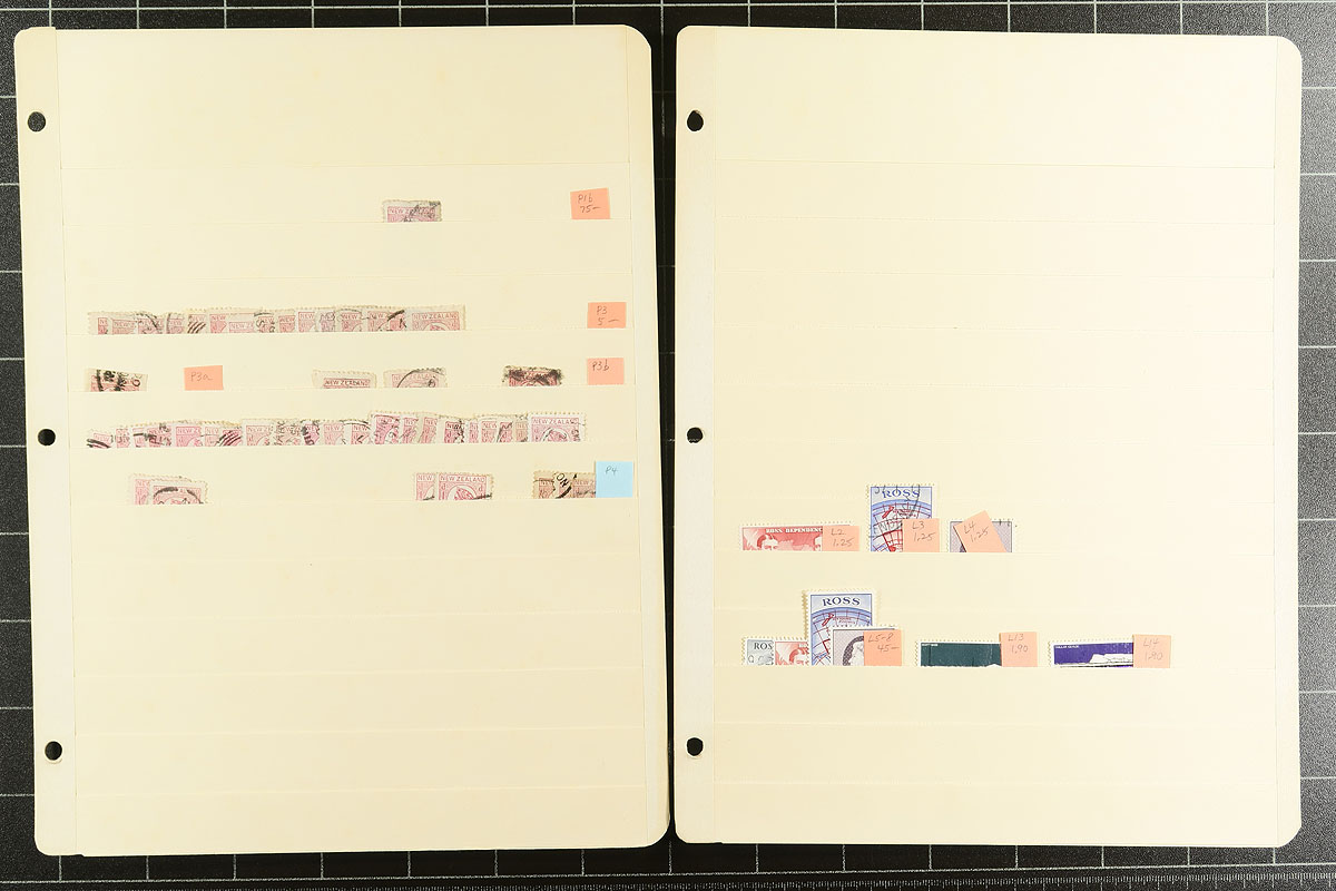An octet of stockpages with a used accumulation of "back of the book" airmails, (3 sets of #C1-C3, #C4, #C5), a good range of postage dues (#J19, #J25, #J27), plus a never seen grouping of Life Insurance issues, plus some newspaper stamps and a touch of early Ross Dependencies issues. Both substantial catalogue value and research opportunity here. Not a dealer’s stock, but a local collectors "overflow", where most of the work has been done for you. Estimate =