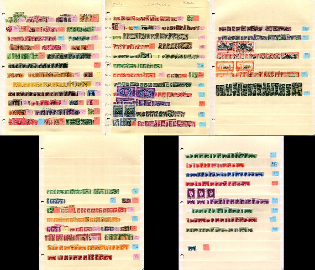 "Officials" and only "Officials" are found in this extensive five stockpage accumulation. Most are overprints, starting with late Victorian issues to 2/-, with #O27-O29, O31, some "Commerce" and "Dominion" plus a good group of King Edward VII to 1/-, a full offering of King George V. There is good coverage of the 1935 and 1940 series, with a couple of 5/- "Arms", finishing with the KGVI and QEII series. The catalogue value adds up quickly here and there could be a couple true gems lurking here. Estimate =