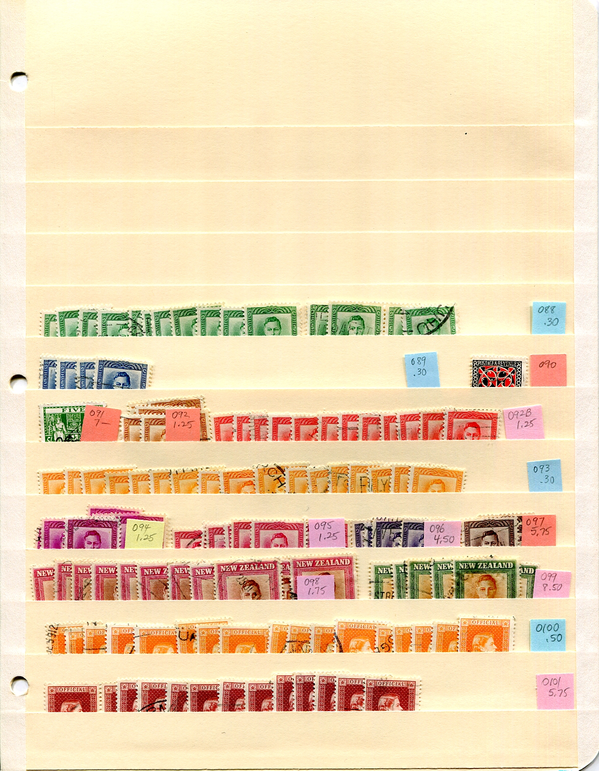 "Officials" and only "Officials" are found in this extensive five stockpage accumulation. Most are overprints, starting with late Victorian issues to 2/-, with #O27-O29, O31, some "Commerce" and "Dominion" plus a good group of King Edward VII to 1/-, a full offering of King George V. There is good coverage of the 1935 and 1940 series, with a couple of 5/- "Arms", finishing with the KGVI and QEII series. The catalogue value adds up quickly here and there could be a couple true gems lurking here. Estimate =