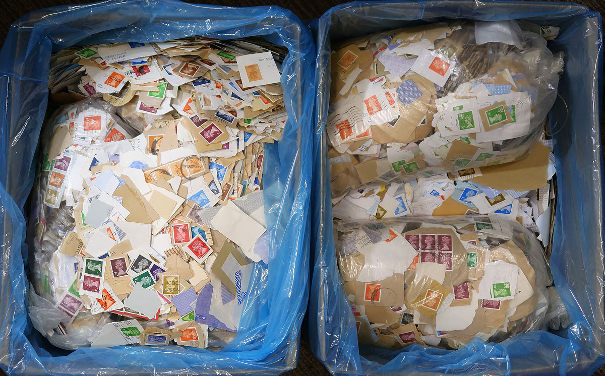 Two U-Haul boxes filled with Machins on paper, with around 30 pounds (13 kg) with thousands of stamps. As received from a range of charity sources over a significant length of time. This has resulted in diversity (expect to find pre-decimal period and newer issues up to about 2010), and a touch of "other material", mostly British or regional issues, but also saw a few worldwide stamps (for the record). This is an opportunity to dig for the many varied and short-lived printings of the world’s longest continually running philatelic issue. Colourful! Estimate =