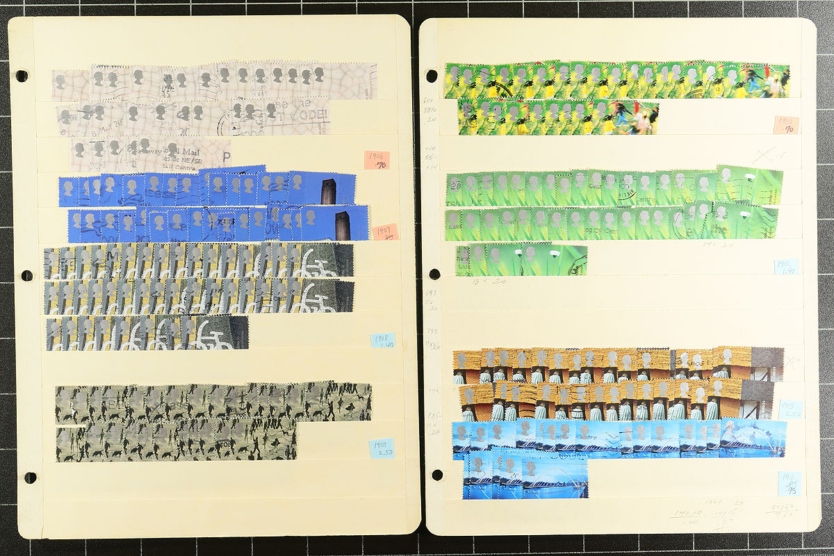 The two "Millenium" sets issued by Great Britain in 1999 and 2000 to celebrate British accomplishments in a wide range of subjects were (and are) popular issues. However, the large number of issues (over 90 different stamps), including overseas rates, make this a challenging group to complete postally used. Part of the reason for this challenge is that so many of these stamps are in this lot! The two main sets are represented in quantities of 20-50 stamps per issue (give or take). None of the perforation variants, nor any complete booklet panes here. Great appearance and neatly organized in a nice padded 3-ring binder. Conservative catalogue value US$2000.00 =