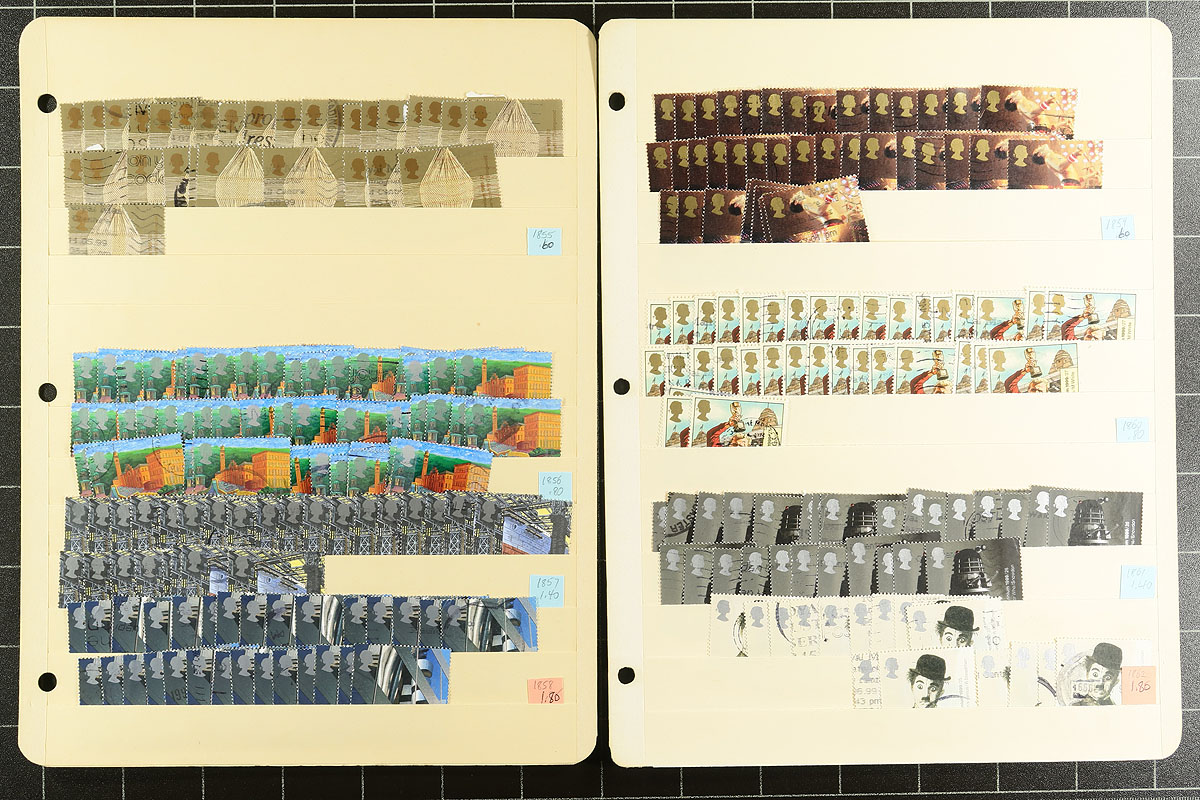 The two "Millenium" sets issued by Great Britain in 1999 and 2000 to celebrate British accomplishments in a wide range of subjects were (and are) popular issues. However, the large number of issues (over 90 different stamps), including overseas rates, make this a challenging group to complete postally used. Part of the reason for this challenge is that so many of these stamps are in this lot! The two main sets are represented in quantities of 20-50 stamps per issue (give or take). None of the perforation variants, nor any complete booklet panes here. Great appearance and neatly organized in a nice padded 3-ring binder. Conservative catalogue value US$2000.00 =