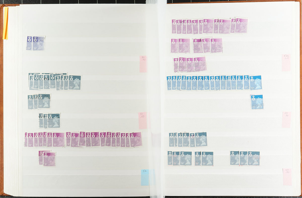 Northern Ireland regional Machin stock half filling a 64-page Lighthouse stockbook. Very full coverage of 1971-2000, missing only a few, and including different die types, and some more recent with syncopated perfs. Most are in the range of 3-30 of a type. There are four copies of #NMH52a (cat $175.00 each), plus the more recent have individual catalogue values up to $10.00 a stamp. Clean, nicely laid out, identified by "MH" numbers. Estimate =