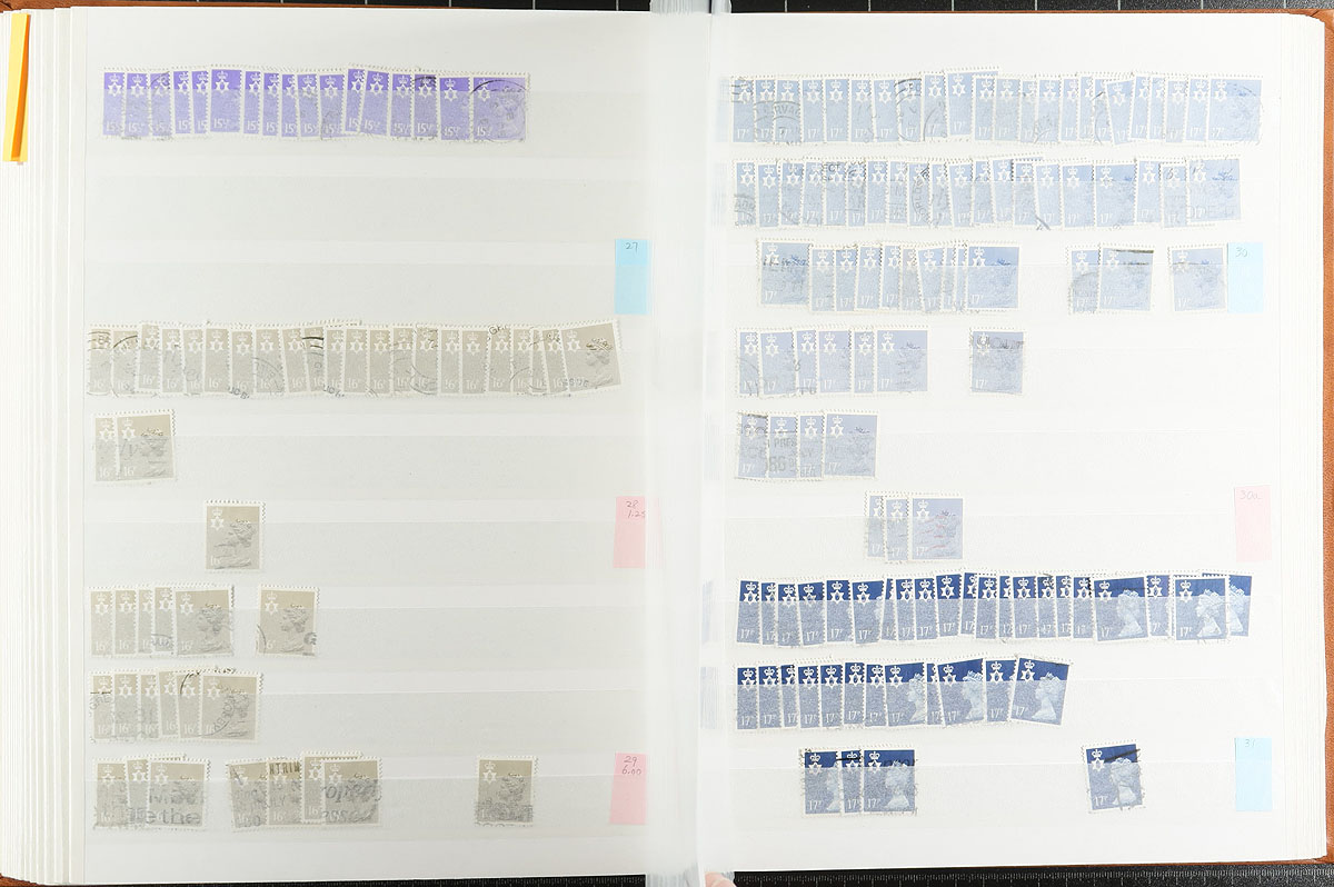 Northern Ireland regional Machin stock half filling a 64-page Lighthouse stockbook. Very full coverage of 1971-2000, missing only a few, and including different die types, and some more recent with syncopated perfs. Most are in the range of 3-30 of a type. There are four copies of #NMH52a (cat $175.00 each), plus the more recent have individual catalogue values up to $10.00 a stamp. Clean, nicely laid out, identified by "MH" numbers. Estimate =