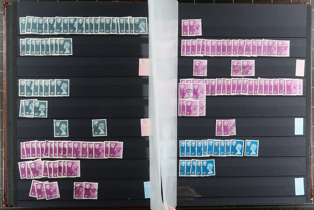 Scottish regional Machin stock half filling a 64-black page Uni-Safe stockbook with a red-brown cover. Very full coverage of 1971-2000, missing only a few (mostly later issues), and including different die types, perforation and colour variants. Most are in the range of 3-30 of a type. There are four copies of #SMH42a (x3), #SMH52a (x2 cat $175.00 each), #SMH62a (x20) plus a number have individual catalogue values up to $10.00 a stamp. Clean, nicely laid out, identified by "MH" numbers. Estimate =