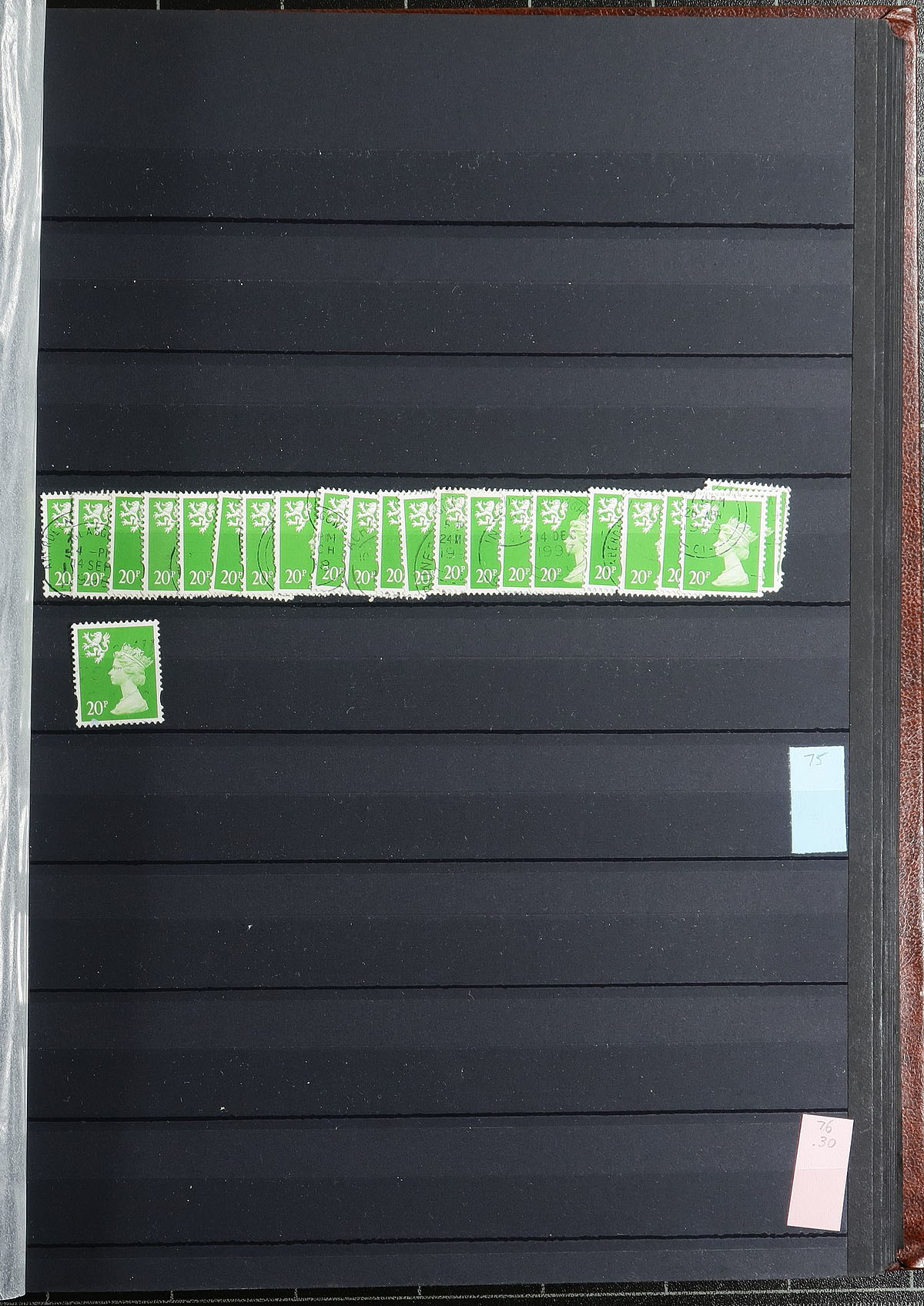 Scottish regional Machin stock half filling a 64-black page Uni-Safe stockbook with a red-brown cover. Very full coverage of 1971-2000, missing only a few (mostly later issues), and including different die types, perforation and colour variants. Most are in the range of 3-30 of a type. There are four copies of #SMH42a (x3), #SMH52a (x2 cat $175.00 each), #SMH62a (x20) plus a number have individual catalogue values up to $10.00 a stamp. Clean, nicely laid out, identified by "MH" numbers. Estimate =