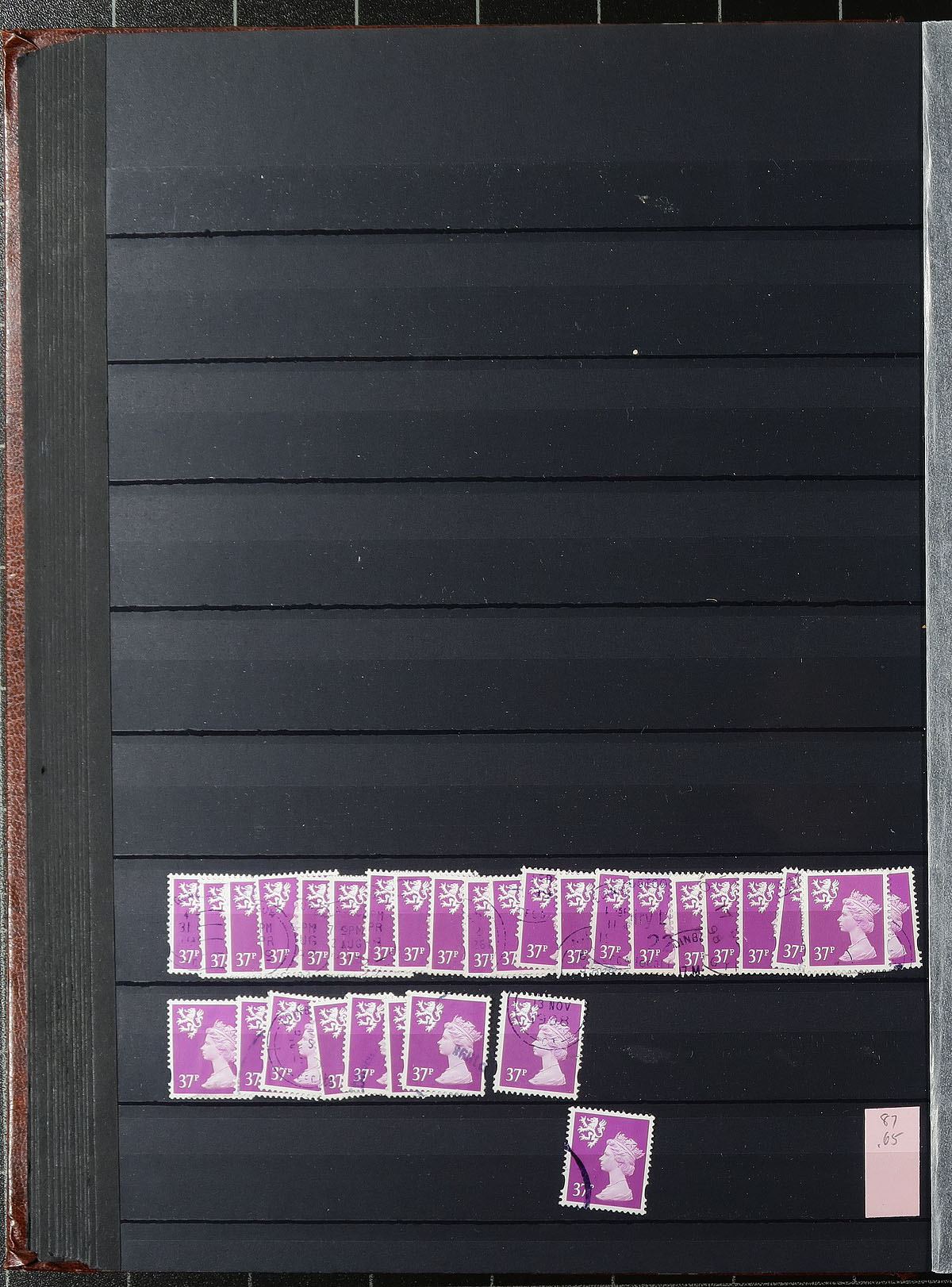 Scottish regional Machin stock half filling a 64-black page Uni-Safe stockbook with a red-brown cover. Very full coverage of 1971-2000, missing only a few (mostly later issues), and including different die types, perforation and colour variants. Most are in the range of 3-30 of a type. There are four copies of #SMH42a (x3), #SMH52a (x2 cat $175.00 each), #SMH62a (x20) plus a number have individual catalogue values up to $10.00 a stamp. Clean, nicely laid out, identified by "MH" numbers. Estimate =