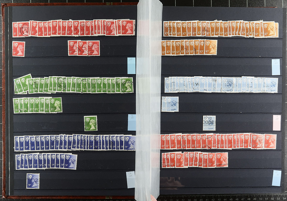 Scottish regional Machin stock half filling a 64-black page Uni-Safe stockbook with a red-brown cover. Very full coverage of 1971-2000, missing only a few (mostly later issues), and including different die types, perforation and colour variants. Most are in the range of 3-30 of a type. There are four copies of #SMH42a (x3), #SMH52a (x2 cat $175.00 each), #SMH62a (x20) plus a number have individual catalogue values up to $10.00 a stamp. Clean, nicely laid out, identified by "MH" numbers. Estimate =
