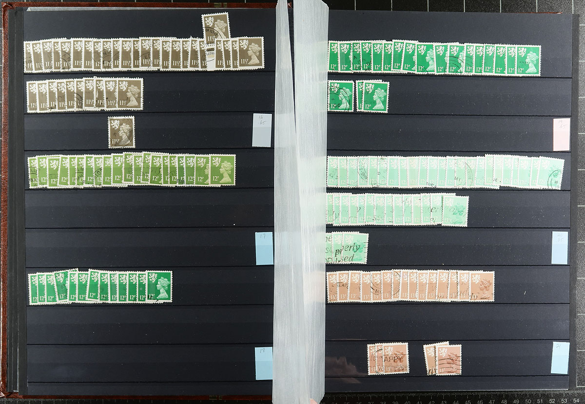 Scottish regional Machin stock half filling a 64-black page Uni-Safe stockbook with a red-brown cover. Very full coverage of 1971-2000, missing only a few (mostly later issues), and including different die types, perforation and colour variants. Most are in the range of 3-30 of a type. There are four copies of #SMH42a (x3), #SMH52a (x2 cat $175.00 each), #SMH62a (x20) plus a number have individual catalogue values up to $10.00 a stamp. Clean, nicely laid out, identified by "MH" numbers. Estimate =