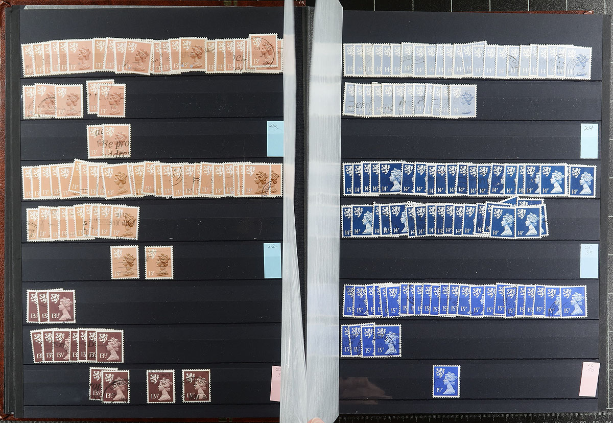 Scottish regional Machin stock half filling a 64-black page Uni-Safe stockbook with a red-brown cover. Very full coverage of 1971-2000, missing only a few (mostly later issues), and including different die types, perforation and colour variants. Most are in the range of 3-30 of a type. There are four copies of #SMH42a (x3), #SMH52a (x2 cat $175.00 each), #SMH62a (x20) plus a number have individual catalogue values up to $10.00 a stamp. Clean, nicely laid out, identified by "MH" numbers. Estimate =