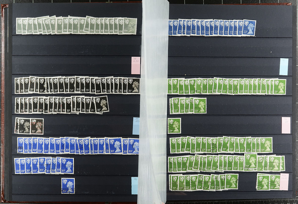 Scottish regional Machin stock half filling a 64-black page Uni-Safe stockbook with a red-brown cover. Very full coverage of 1971-2000, missing only a few (mostly later issues), and including different die types, perforation and colour variants. Most are in the range of 3-30 of a type. There are four copies of #SMH42a (x3), #SMH52a (x2 cat $175.00 each), #SMH62a (x20) plus a number have individual catalogue values up to $10.00 a stamp. Clean, nicely laid out, identified by "MH" numbers. Estimate =