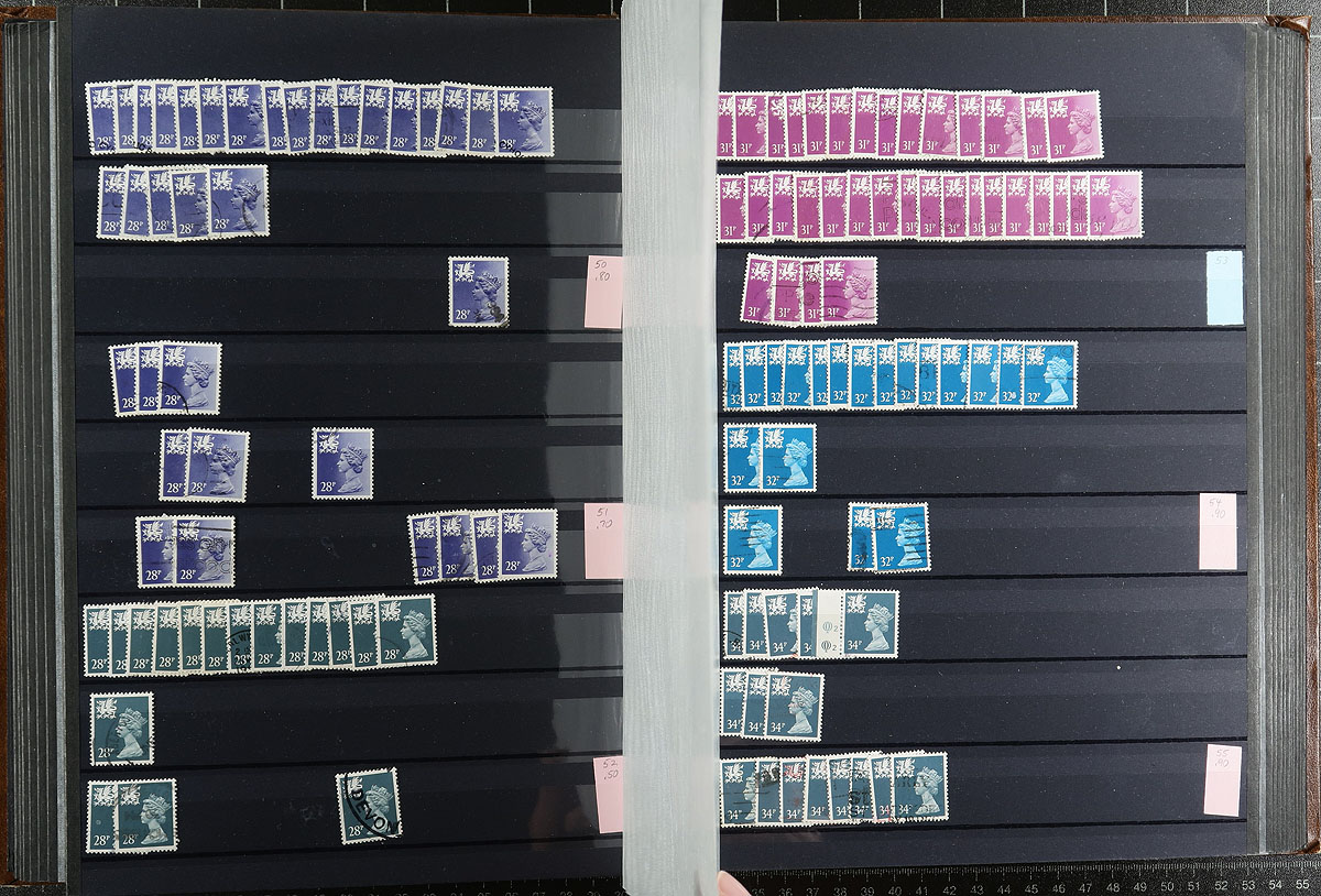 Welsh regional Machin stock half filling a 64-black page Lighthouse stockbook with a brown cover. Very full coverage of 1971-2000, missing only a few (mostly later issues), and including different die types, perforation and colour variants. Most are in the range of 3-30 of a type. There are examples of #WMMH30a and #WMMH35 plus a number with individual catalogue values up to $10.00 a stamp. Clean, nicely laid out, identified by "MH" numbers. Estimate =