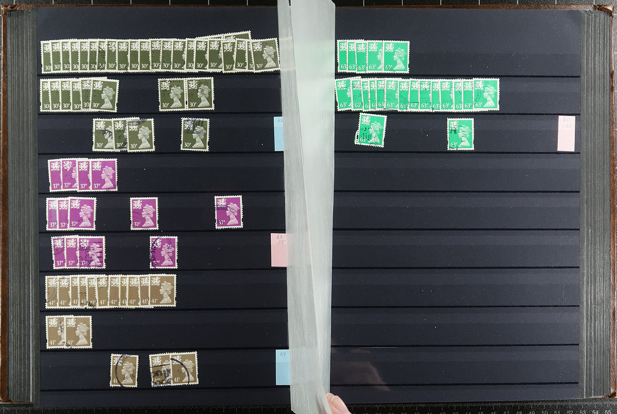 Welsh regional Machin stock half filling a 64-black page Lighthouse stockbook with a brown cover. Very full coverage of 1971-2000, missing only a few (mostly later issues), and including different die types, perforation and colour variants. Most are in the range of 3-30 of a type. There are examples of #WMMH30a and #WMMH35 plus a number with individual catalogue values up to $10.00 a stamp. Clean, nicely laid out, identified by "MH" numbers. Estimate =