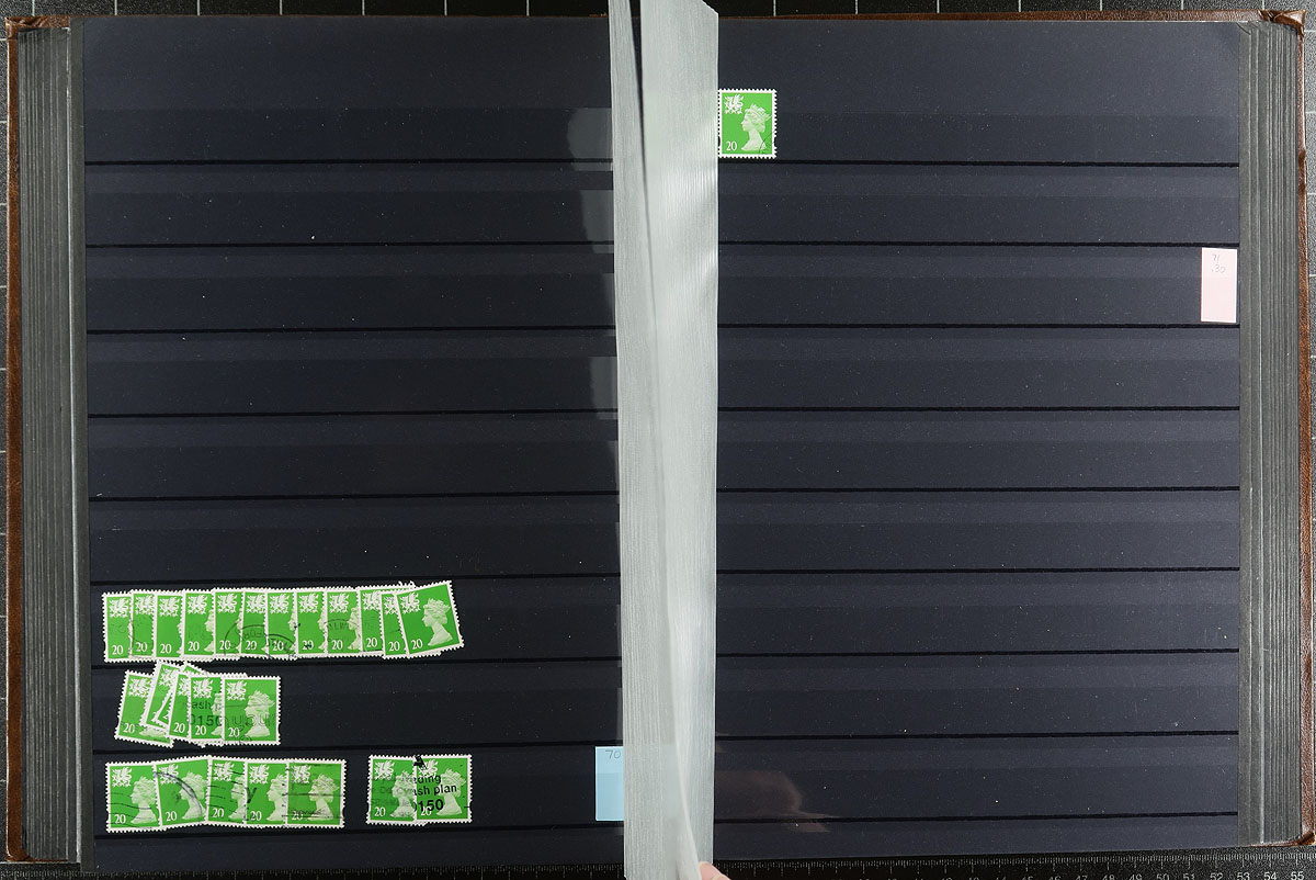 Welsh regional Machin stock half filling a 64-black page Lighthouse stockbook with a brown cover. Very full coverage of 1971-2000, missing only a few (mostly later issues), and including different die types, perforation and colour variants. Most are in the range of 3-30 of a type. There are examples of #WMMH30a and #WMMH35 plus a number with individual catalogue values up to $10.00 a stamp. Clean, nicely laid out, identified by "MH" numbers. Estimate =