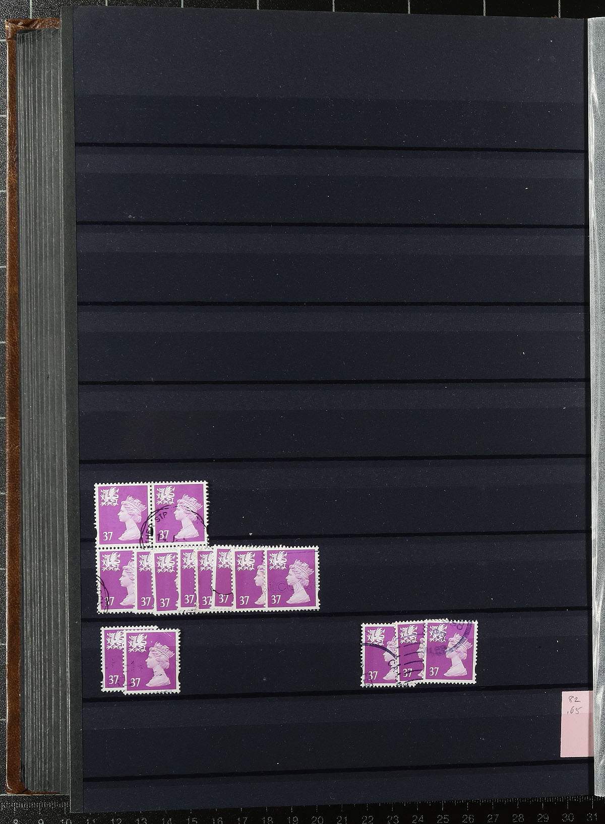 Welsh regional Machin stock half filling a 64-black page Lighthouse stockbook with a brown cover. Very full coverage of 1971-2000, missing only a few (mostly later issues), and including different die types, perforation and colour variants. Most are in the range of 3-30 of a type. There are examples of #WMMH30a and #WMMH35 plus a number with individual catalogue values up to $10.00 a stamp. Clean, nicely laid out, identified by "MH" numbers. Estimate =