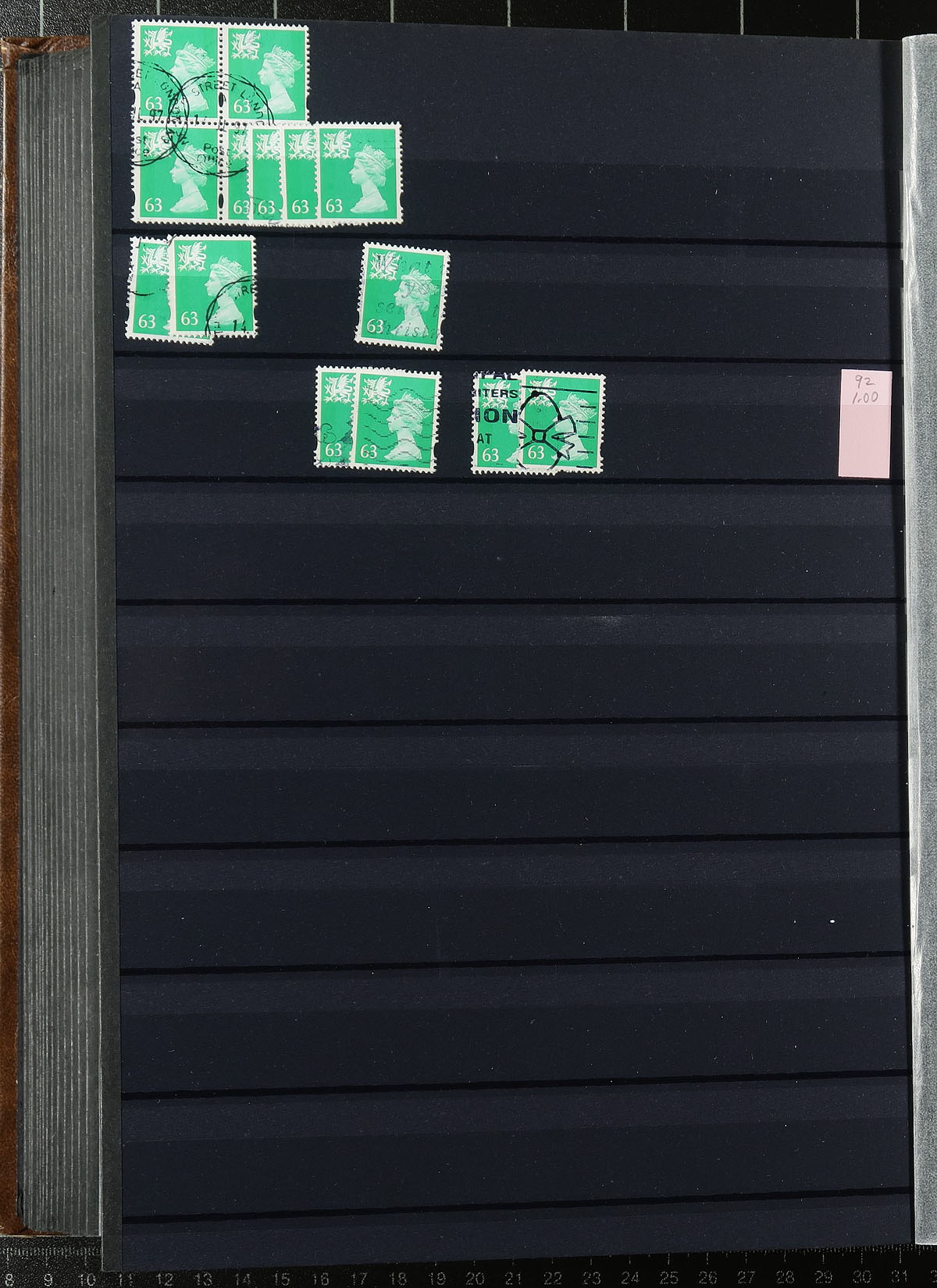 Welsh regional Machin stock half filling a 64-black page Lighthouse stockbook with a brown cover. Very full coverage of 1971-2000, missing only a few (mostly later issues), and including different die types, perforation and colour variants. Most are in the range of 3-30 of a type. There are examples of #WMMH30a and #WMMH35 plus a number with individual catalogue values up to $10.00 a stamp. Clean, nicely laid out, identified by "MH" numbers. Estimate =