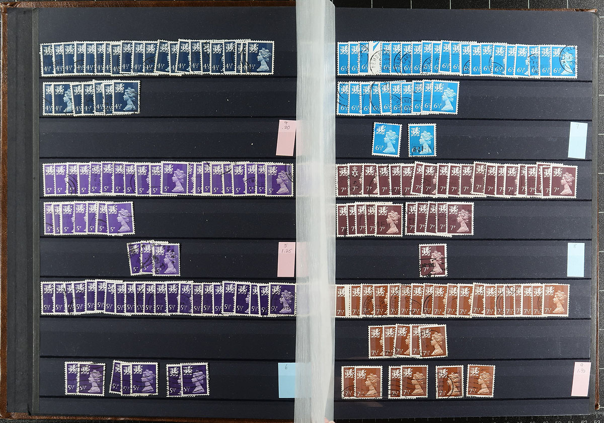 Welsh regional Machin stock half filling a 64-black page Lighthouse stockbook with a brown cover. Very full coverage of 1971-2000, missing only a few (mostly later issues), and including different die types, perforation and colour variants. Most are in the range of 3-30 of a type. There are examples of #WMMH30a and #WMMH35 plus a number with individual catalogue values up to $10.00 a stamp. Clean, nicely laid out, identified by "MH" numbers. Estimate =