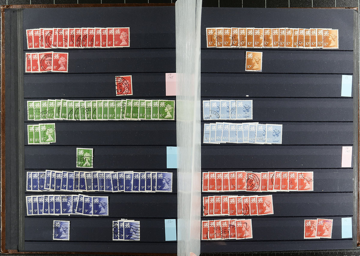 Welsh regional Machin stock half filling a 64-black page Lighthouse stockbook with a brown cover. Very full coverage of 1971-2000, missing only a few (mostly later issues), and including different die types, perforation and colour variants. Most are in the range of 3-30 of a type. There are examples of #WMMH30a and #WMMH35 plus a number with individual catalogue values up to $10.00 a stamp. Clean, nicely laid out, identified by "MH" numbers. Estimate =