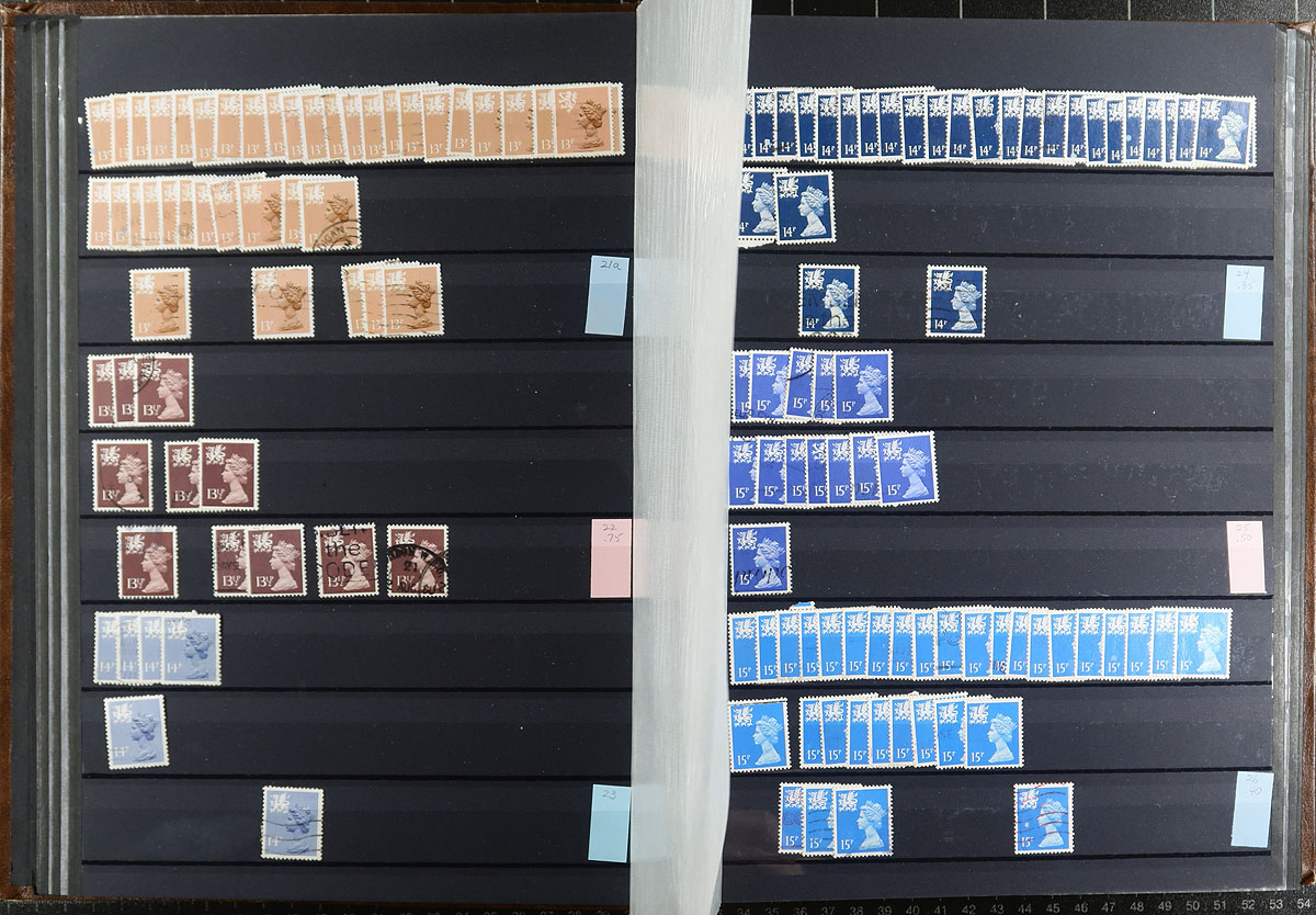 Welsh regional Machin stock half filling a 64-black page Lighthouse stockbook with a brown cover. Very full coverage of 1971-2000, missing only a few (mostly later issues), and including different die types, perforation and colour variants. Most are in the range of 3-30 of a type. There are examples of #WMMH30a and #WMMH35 plus a number with individual catalogue values up to $10.00 a stamp. Clean, nicely laid out, identified by "MH" numbers. Estimate =