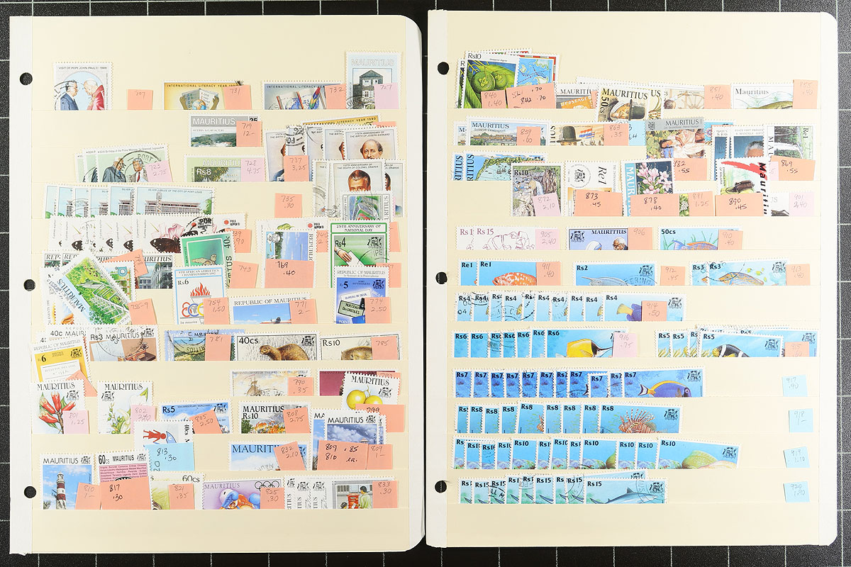 If you love Mauritius or British Africa colonies, this remarkable accumulation is for you. Housed on 27 manila stockpages, with heavy coverage from Queen Victoria issues into the 1990's, there are beautiful sets and singles throughout, with better and nice cancels amongst the used. The QV side faces are here in quantity as are the "Coat of Arms". There is a good mix of KGV and KGVI "Keyplates" (the 5/- are revenue cancelled and not considered). QEII definitives to 10/-, with some Common Design issues, and lots of topicals, plus some nice Special Delivery and Postage due issues. The modern material is mostly used, otherwise there is a good mix of mint and used, with lots of individual stamps cataloguing $10-$20 seen throughout. Individually identified by Scott, with (slightly older) prices. OUTSTANDING offering! Estimate =