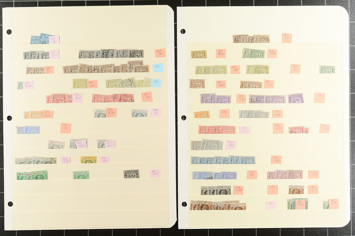 If you love Mauritius or British Africa colonies, this remarkable accumulation is for you. Housed on 27 manila stockpages, with heavy coverage from Queen Victoria issues into the 1990's, there are beautiful sets and singles throughout, with better and nice cancels amongst the used. The QV side faces are here in quantity as are the "Coat of Arms". There is a good mix of KGV and KGVI "Keyplates" (the 5/- are revenue cancelled and not considered). QEII definitives to 10/-, with some Common Design issues, and lots of topicals, plus some nice Special Delivery and Postage due issues. The modern material is mostly used, otherwise there is a good mix of mint and used, with lots of individual stamps cataloguing $10-$20 seen throughout. Individually identified by Scott, with (slightly older) prices. OUTSTANDING offering! Estimate =