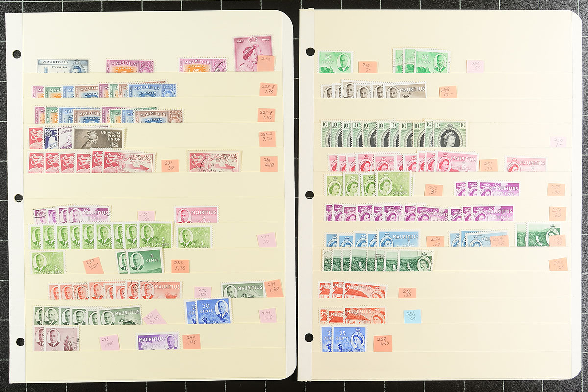 If you love Mauritius or British Africa colonies, this remarkable accumulation is for you. Housed on 27 manila stockpages, with heavy coverage from Queen Victoria issues into the 1990's, there are beautiful sets and singles throughout, with better and nice cancels amongst the used. The QV side faces are here in quantity as are the "Coat of Arms". There is a good mix of KGV and KGVI "Keyplates" (the 5/- are revenue cancelled and not considered). QEII definitives to 10/-, with some Common Design issues, and lots of topicals, plus some nice Special Delivery and Postage due issues. The modern material is mostly used, otherwise there is a good mix of mint and used, with lots of individual stamps cataloguing $10-$20 seen throughout. Individually identified by Scott, with (slightly older) prices. OUTSTANDING offering! Estimate =