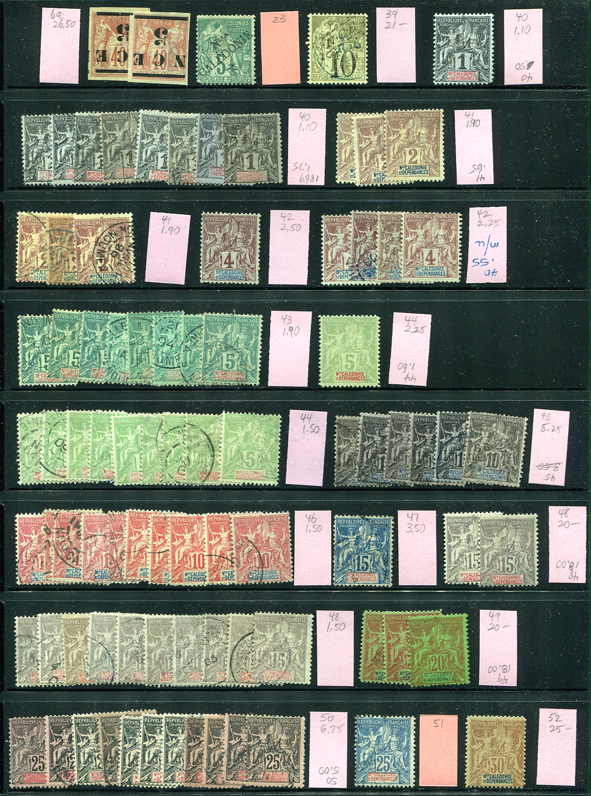 Two pages early French Colonial issues with a mix of mint and used, and individual stamps cataloguing up to $125.00 each. The strength is in the Navigation and Commerce issue (#55 x2 mint) plus the "Jubilee" overprint (mint #78 x3 and #79 x2). Some cancel potential, but this is a straightforwardly attractive and valuable accumulation. 2024 Scott US$1369.50 =