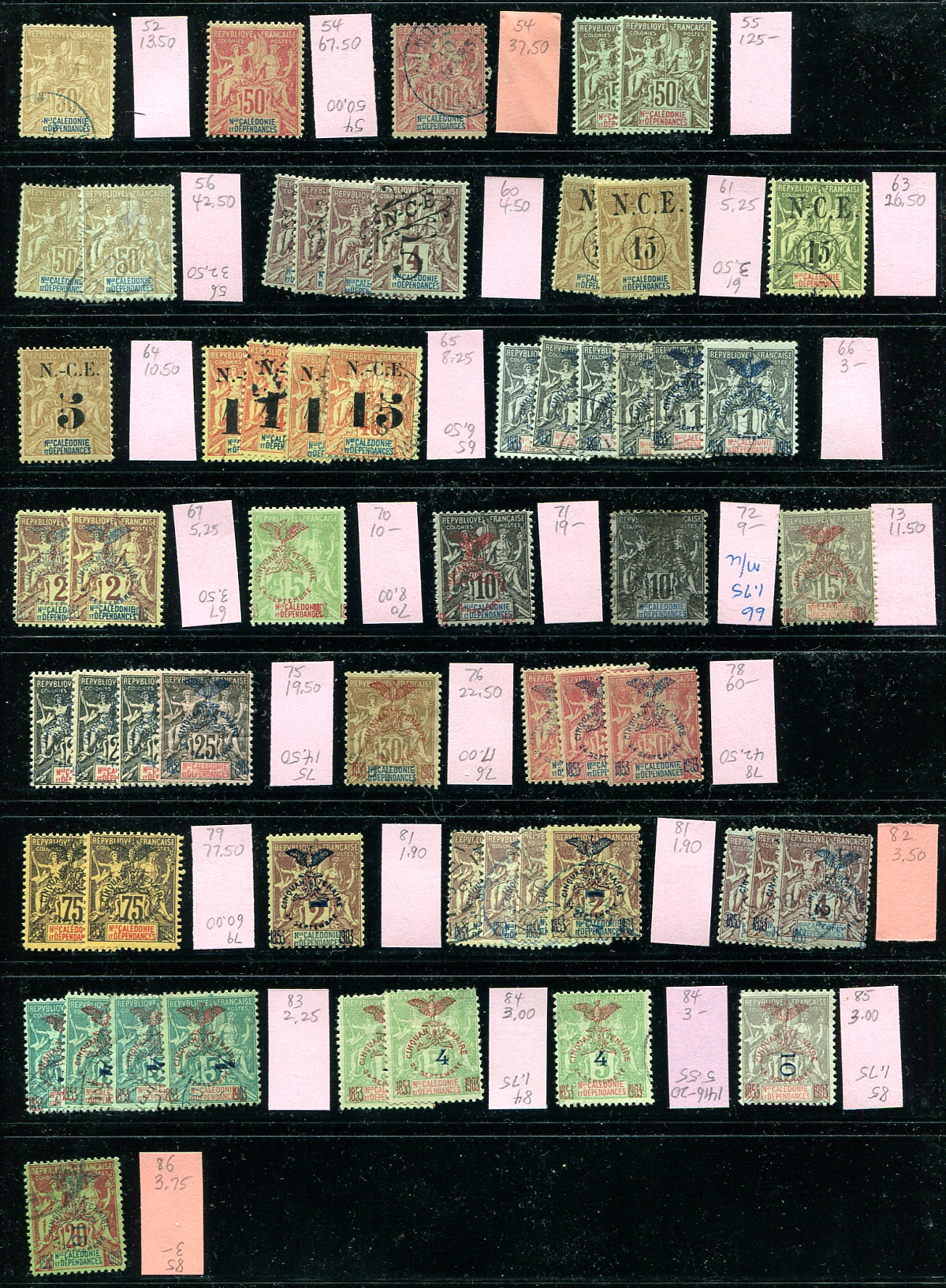 Two pages early French Colonial issues with a mix of mint and used, and individual stamps cataloguing up to $125.00 each. The strength is in the Navigation and Commerce issue (#55 x2 mint) plus the "Jubilee" overprint (mint #78 x3 and #79 x2). Some cancel potential, but this is a straightforwardly attractive and valuable accumulation. 2024 Scott US$1369.50 =