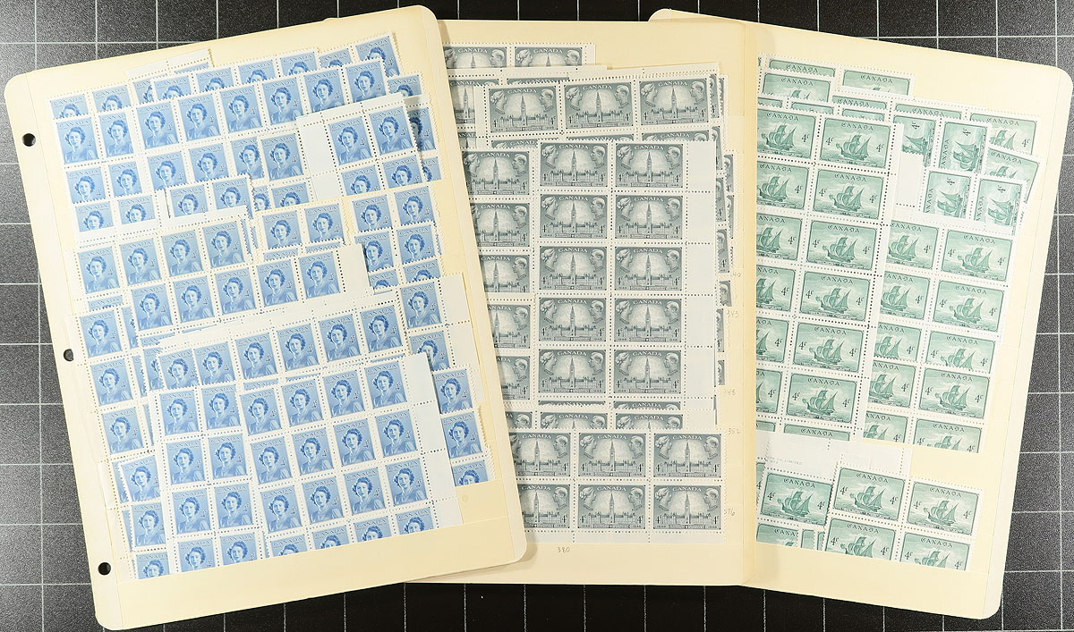 King George V and VI mint, never hinged, accumulation on manila stockpages. Lots of value here, starting with the 3c 1927 Jubilee, and noting 8c orange "Arch" (#172, 55 copies at $17.00 each), #194 (x4), #204 (20), some pairs of #210/210i, Silver Jubilees to 5c, Pictorials to 8c, KGVI "Muftis", War and Peace issues to 10c, with some later 1940's commemoratives and definitives. As well as having beautiful gum, most have been selected for having good centering. Thousands of dollars of catalogue value here. Estimate =