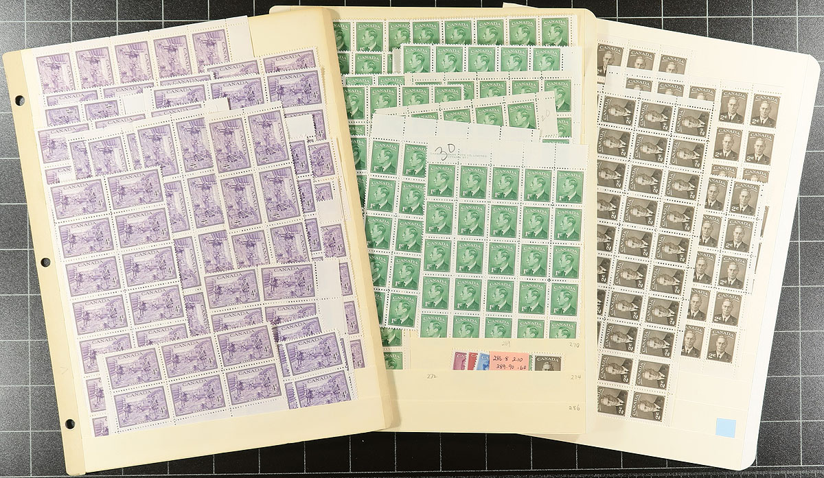 King George V and VI mint, never hinged, accumulation on manila stockpages. Lots of value here, starting with the 3c 1927 Jubilee, and noting 8c orange "Arch" (#172, 55 copies at $17.00 each), #194 (x4), #204 (20), some pairs of #210/210i, Silver Jubilees to 5c, Pictorials to 8c, KGVI "Muftis", War and Peace issues to 10c, with some later 1940's commemoratives and definitives. As well as having beautiful gum, most have been selected for having good centering. Thousands of dollars of catalogue value here. Estimate =