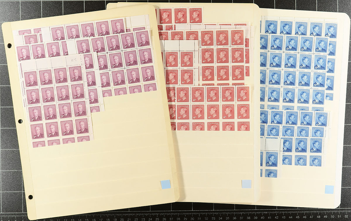 King George V and VI mint, never hinged, accumulation on manila stockpages. Lots of value here, starting with the 3c 1927 Jubilee, and noting 8c orange "Arch" (#172, 55 copies at $17.00 each), #194 (x4), #204 (20), some pairs of #210/210i, Silver Jubilees to 5c, Pictorials to 8c, KGVI "Muftis", War and Peace issues to 10c, with some later 1940's commemoratives and definitives. As well as having beautiful gum, most have been selected for having good centering. Thousands of dollars of catalogue value here. Estimate =