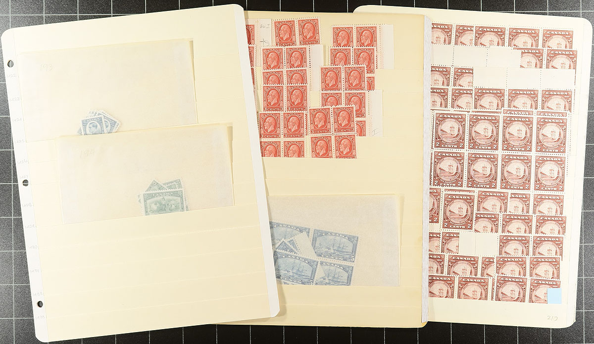 King George V and VI mint, never hinged, accumulation on manila stockpages. Lots of value here, starting with the 3c 1927 Jubilee, and noting 8c orange "Arch" (#172, 55 copies at $17.00 each), #194 (x4), #204 (20), some pairs of #210/210i, Silver Jubilees to 5c, Pictorials to 8c, KGVI "Muftis", War and Peace issues to 10c, with some later 1940's commemoratives and definitives. As well as having beautiful gum, most have been selected for having good centering. Thousands of dollars of catalogue value here. Estimate =